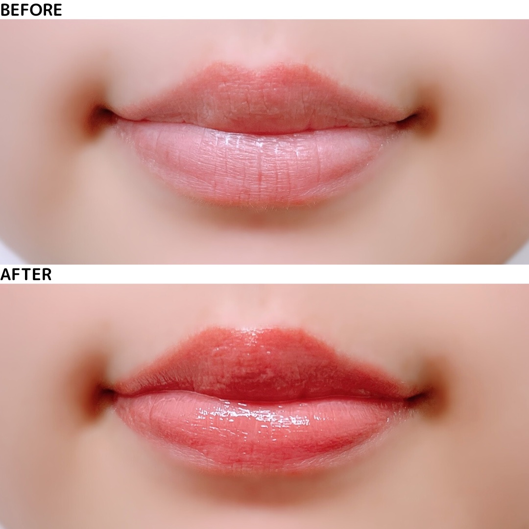透明ジェル膜が唇をコートし、ツヤと発色が続くリップ💄 テクスチャーは水っぽくサラッとしています✨ 塗って唇をすり合わせずに5分ほど待つとツヤツヤなのに色移り、色落ちしにくくなります🙌🏻