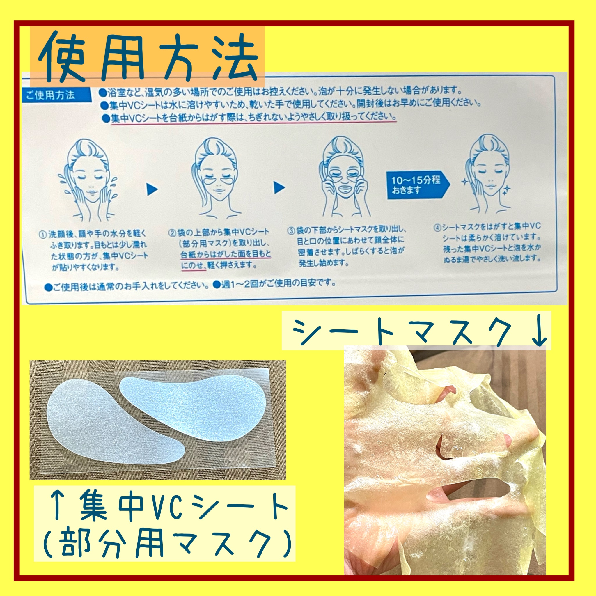 集中VCシートとシートマスクが入っとって先に集中VCシートを下まぶたに付けて上からシートマスクを付ける👍 とにかくどんどん泡立つ🫧🫧🫧 こん時 酔ってたからか、めちゃおもろくてw 1人でずっと笑っとった😆 洗い流した肌はモチモチよりツルツルな感じ✨
