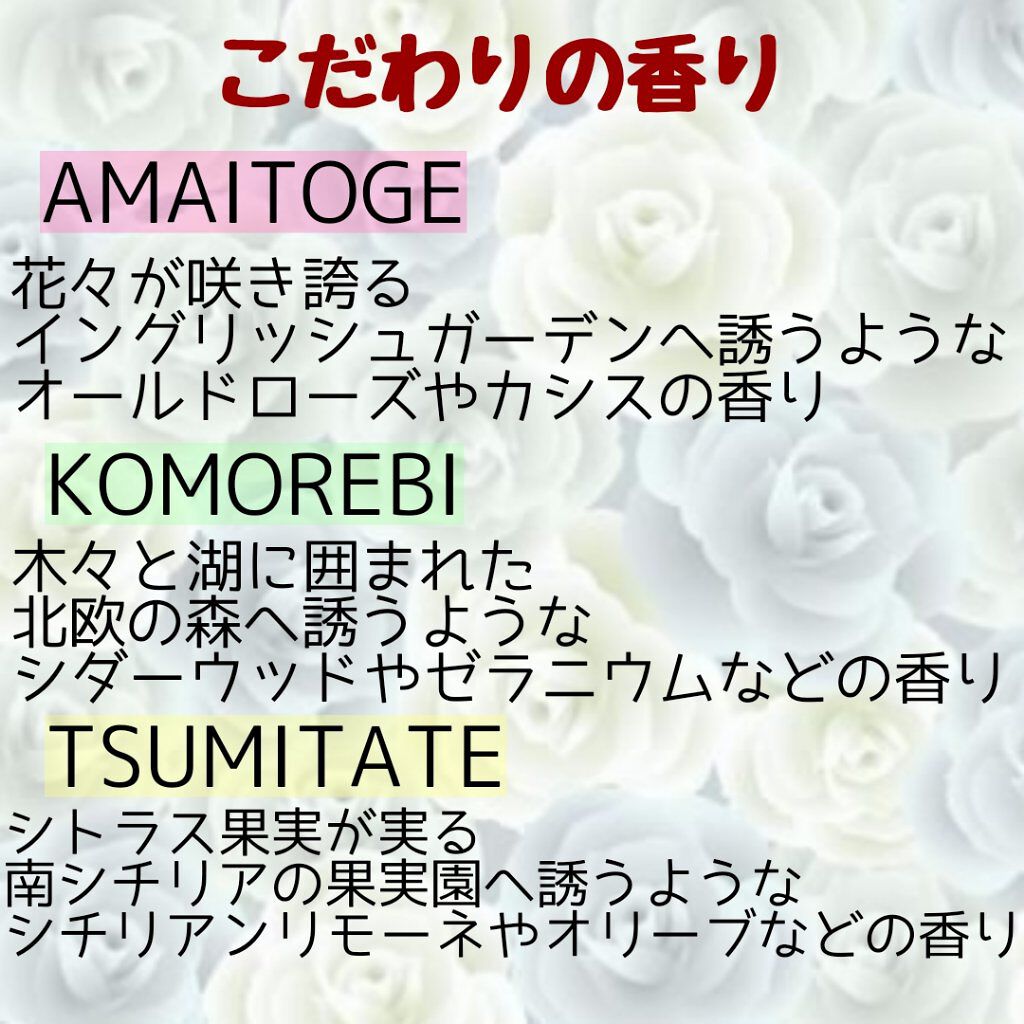 ○細かくふんわりやわらかな霧のようなミストで、日中に不足した水分を潤追い(うるおい)ケア ○天然製油*配合の、選べる3種の香り *香料の一部 ○独自開発のヒアロサポート(保湿成分)で潤追いを補ってキープ ヒアロサポート:ヒアルロン酸Na、アセチルグルコサミン、メチルセリン ・TSUMITATE シチリアレモン&オリーブ 柑橘系の爽やかな香り 元気を出したい時に ・AMAITOGE オールドローズ&カシス ローズを中心にフローラル系 ロマンティックな気分になりたい時 ・KOMOREBI シダーウッド&ゼラニウム まるで森林浴をしているかのような ウッディな香り 心を落ち着けたい時 個人的にこれが一番好き♡ 3種それぞれの癒される香りなのでその日の気分のよって使い分けるのも良さそうです☺️✨ メイク直しの時に使えばリフレッシュ出来て良さげです🥰 ミストも細かくてメイク直しにピッタリ! 持ち運びやすいボトルで、パケも可愛らしい❤️ 日中の乾きが気になる時によく使ってます☺️