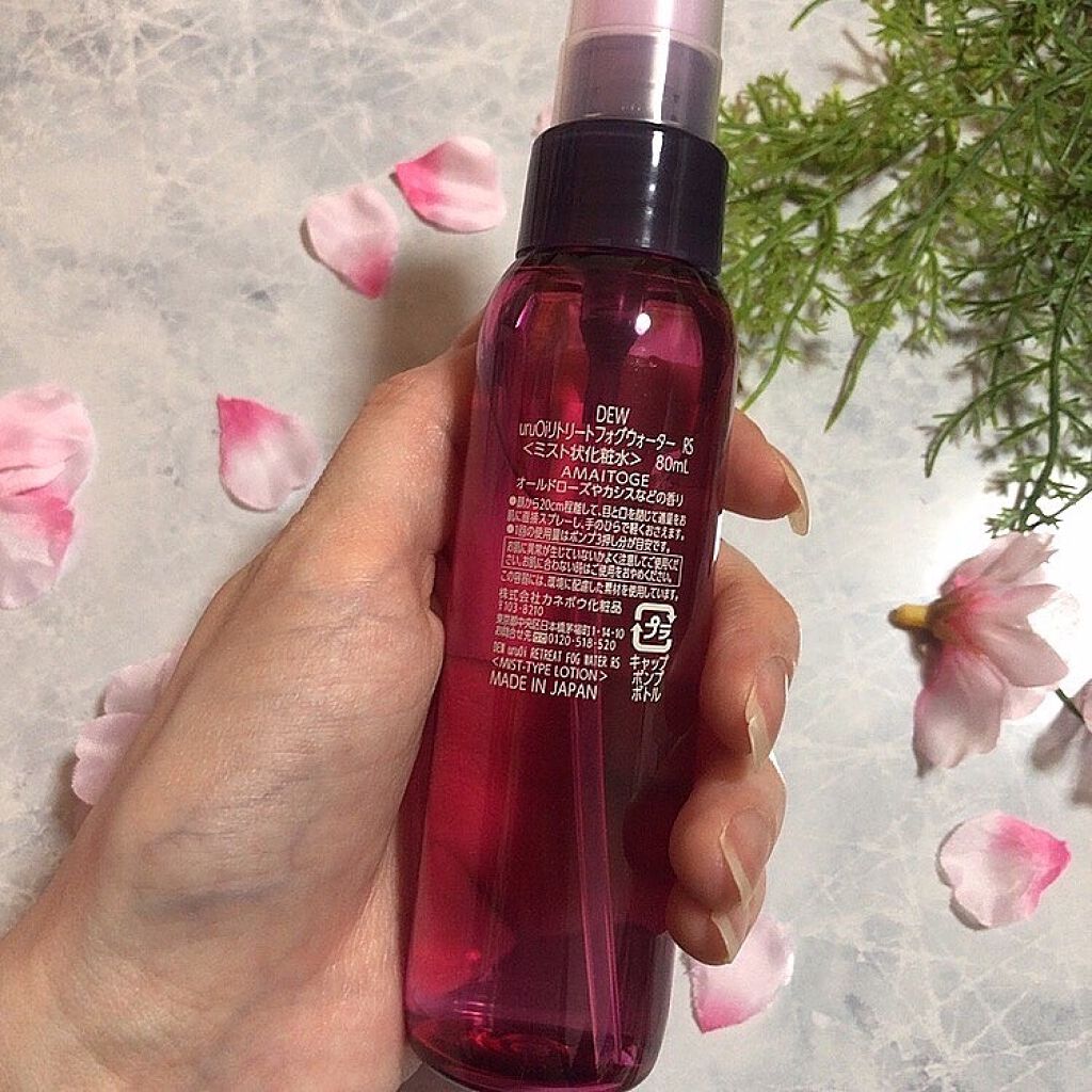 DEW潤追いリトリートフォグウォーター(ミスト状化粧水)花々が咲きほこるイングリッシュガーデンへ誘うようなオールドローズやカシスの香り🥀きめ細かい霧状のミストで、さっぱりした使い心地で気持ちいいです😌✨ふんわりローズの香りも、リラックスできて気に入ってます❤️メイク前やメイク後はもちろん、お風呂上がりや寝る前、日中の乾燥対策にもいいですね😊✨