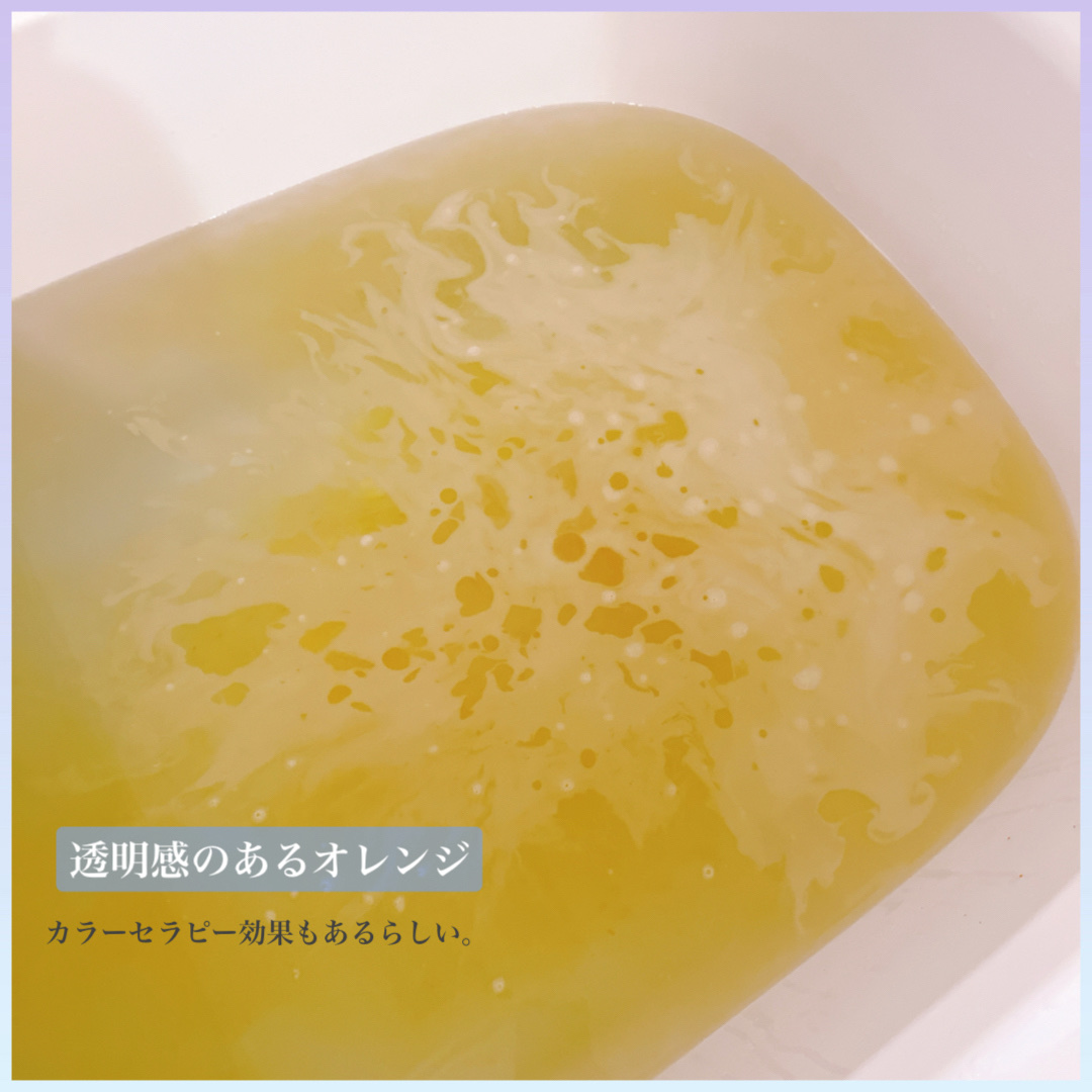 フレッシュでほんのり甘い香り ネロリの精油を配合 ネロリは、不安や緊張を緩和してくれて 明るい気持ちに導いてくれる効果があります ストレス緩和や自律神経の調整、 肌の新陳代謝も促進✨ お湯の色はオレンジ🍊 どことなく落ち着く香りでリラックスできます 日々の疲れを癒したいときにおすすめです🌼