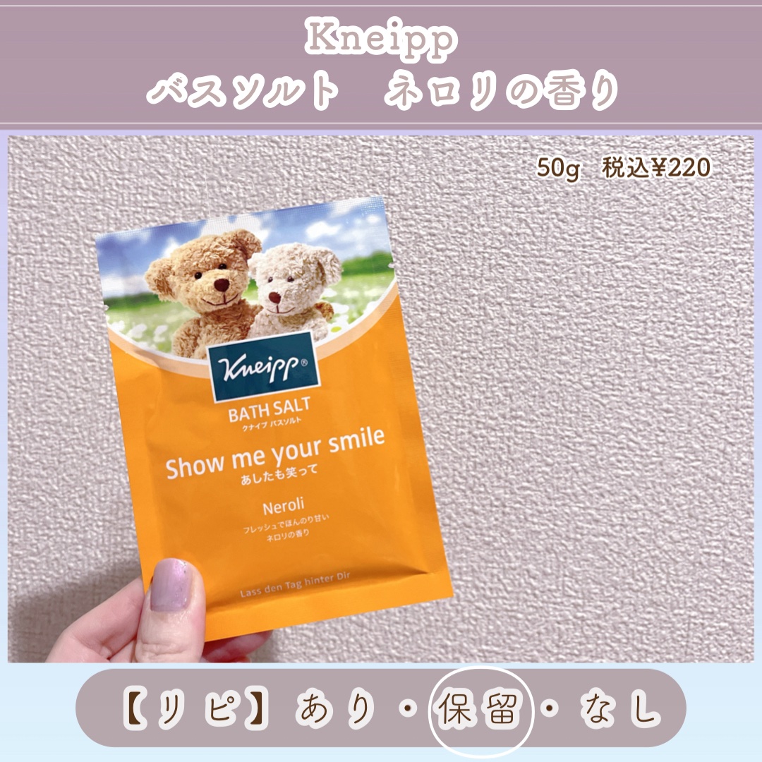 クナイプバスソルトネロリの香り50gです。LIPSさんで購入しました。少し寒くて温まりたかったので使いました。クマが可愛らしいパッケージ🍀🧸鮮やかなオレンジ色で、湯船に溶かすとイエローになりました🧡ネロリの香りにとても癒されます。疲れた時にも...