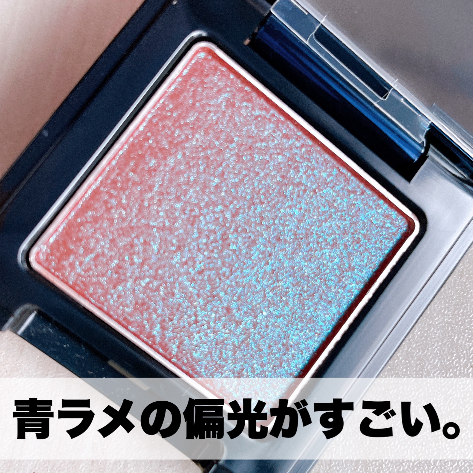 カラーは迷ったけれど、先日の青ラメ戦(マジョマジョ冷凍ベリー)に敗れていたのでこちらのカラーに💎´-角度で煌めきかたが変わる偏光ラメ。可愛い💓 ベースはブラウンで青ラメが輝きます…✨ギラギラというよりチラチラ。ぎっしりのラメが美しくきらめいて最高♡ ベースのブラウンが紫みがあるのでピンクのハイライトカラーと合わせると相性が良くてかわいかったです。キラキラ好きなので、かなりテンション上がった⤴︎⤴︎ エレガンスラズル、カラーメイク好きにはたまらないです💓