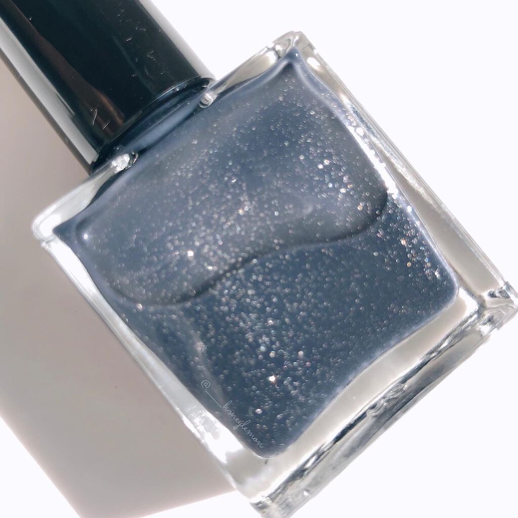 シアーなブルーブラックにシルバーパールがちらちら輝いてとってもおしゃれ。 液はさらっとしててムラになりやすいです。そのムラも楽しめる! 一度塗りは結構薄めの発色で、動画では2度塗りしています。 もちはあまり良くないです。