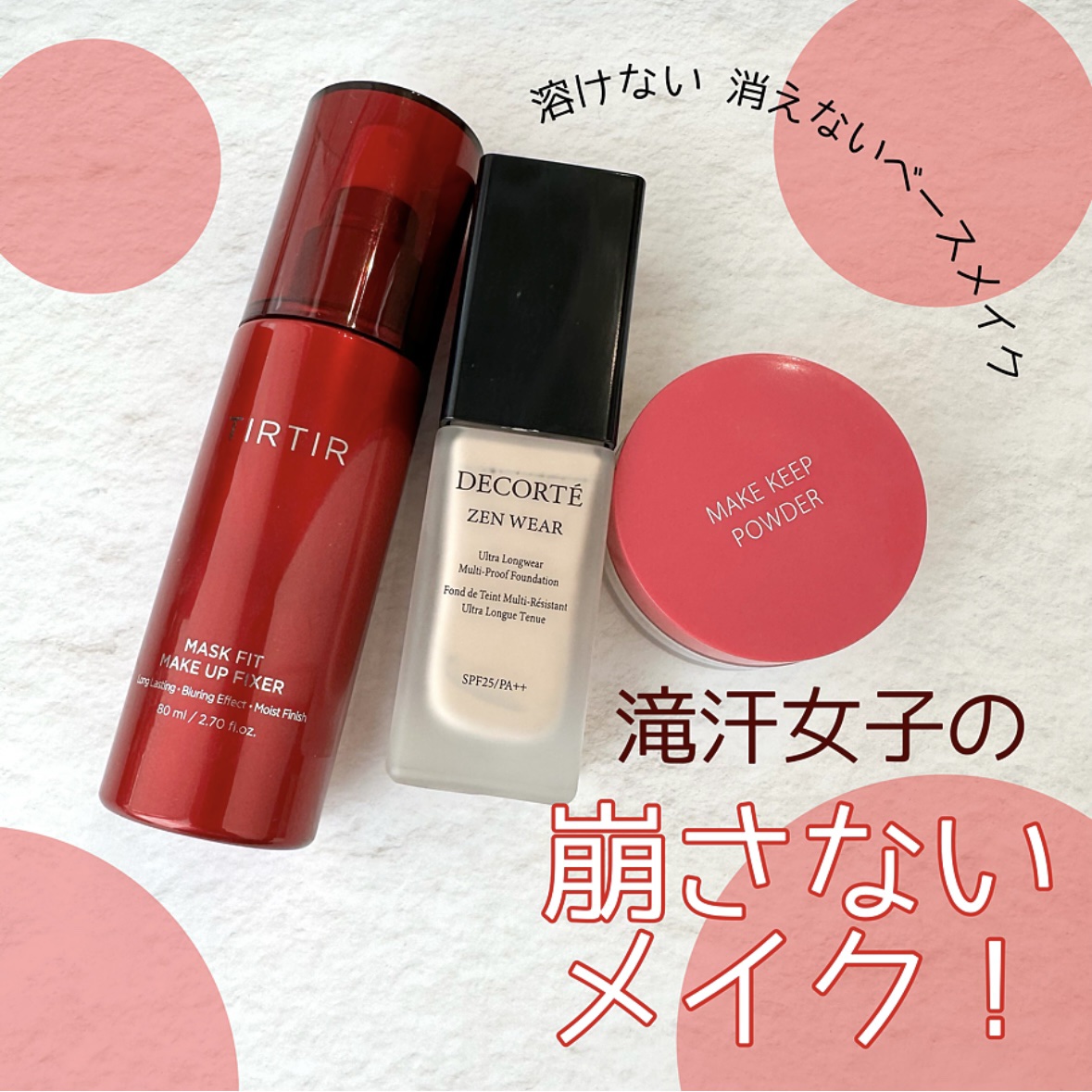 滝汗女子のお守りベースメイク/出産してから何故か汗っかきになり、仕事中は汗だくな私😂それでもメイクはしたい!そんな私が、滝汗でも崩したくない時のベースメイクを紹介しました✨崩れないコツと言えば、⭐️スキンケアをしっかりした後、表面の油分をティッシュオフする⭐️ベースメイクは極力薄く薄く!がポイント。ベースメイクが薄めの方が寄れにくいです!私は崩したくない時はゼンウェアフルイドを塗っていますが、下地なしで日焼け止めのみの方が、より密着し崩れにくかったように思います👍✨そして、皮脂吸着系パウダーとフィックスミストはマスト✨私のメイク崩れは皮脂というより汗崩れですが、メイクキープパウダーは汗にも強かったです👍TIRTIRのフィックスミストも、他のフィックスミストと比べて特別に崩れにくいとまでは行かないですが、とにかく細かいミストが均一に肌につくような使用感がとても良いので推しです💖ぜひぜひ、お店でチェックしてみてください✨#崩れにくいベースメイク#崩れ防止メイク#ゼンウェアフルイド#マスクフィットメイクアップフィクサー#メイクキープパウダー#コスメデコルテ#tirtir#kose#コスメレビュー
