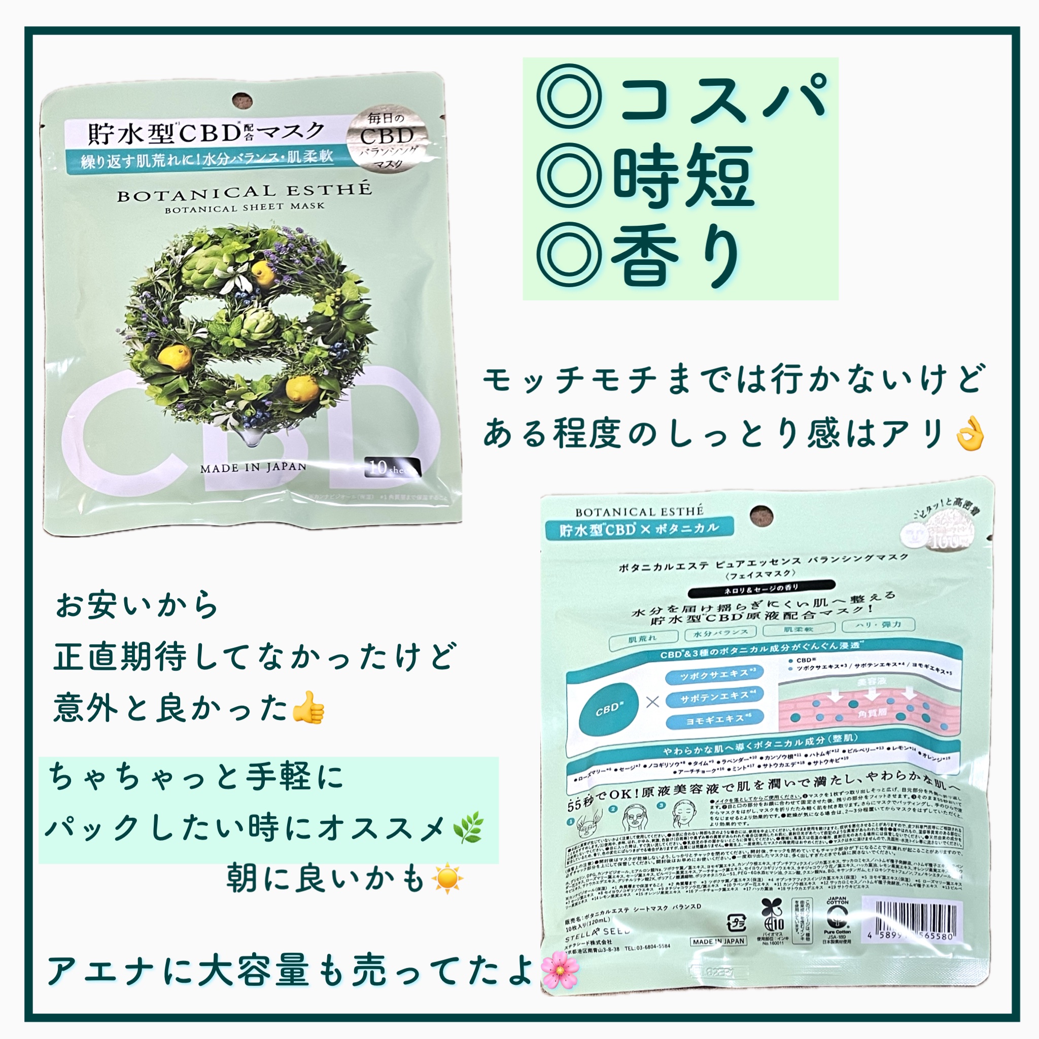 意外と良かった👍コスパ&タイパ抜群パックで手軽に水分補給🌿○●----------------------------------●○BOTANICALESTHEピュアエッセンスバランシングマスク○●----------------------------------●○MEGUMI信者になりかけの私…「安くても良いから毎日パックせよ」との言葉を受けて安くて毎日使えるお手軽パックを探し中🔍ふらっと立ち寄ったアエナで安い上に短時間でOKの日本製パックを発見💡敏感肌でパックとの相性が悪いことが多いし安いし正直期待してなかったんだけどこれが意外に良かったんでご報告🥴◎薄いシートが好みの私にはちょい厚め→許容範囲👍◎香りの好みがうるさい私→好みのハーブ系🌿◎合わないとすぐピリピリしちゃう→気にならない程度🤔というか、すぐ剥がすから大丈夫w◎安いし効果あるんか?→剥がした後、しっとり肌✨このところ、謎の肌荒れ中で鼻もかんでないのに鼻の下がボロボロ皮剥けしてたり上瞼がカサカサしてたり…とにかく保湿に全振りしとるので手軽に保湿できるのはありがたい❤︎つーか、安いと思うたんやけど定価は¥700くらいやねんな…アエナどうなっとるんやw30枚入りのBOXタイプもあったんで大容量で買うのもアリかも🥴手軽に時短でパックしたい時にオススメ✨ベタベタしないから朝に使うのも良さげ◎---------------------------------ところでしばらく投稿しなかったのははじめてギックリ腰になったからwスマホ見るのもしんどかった🫨ババァはあかんな…肌荒れが治るまで、刺激のありそうな物も使えんし…でも‼️いつのまにかメガ割&楽天SSの時期になっとってすでにプレメガ割で購入した物もあるので気分アゲて、またレビューするよー🥴🩷#今月のご機嫌コスメ#夏に備えるスキンケア#パック_毎日#パックおすすめ#敏感肌_パック#パック_保湿#ツボクサ#敏感肌_スキンケア#サボテン#ヨモギ#肌荒れ_パック#揺らぎ肌#水分#朝パック