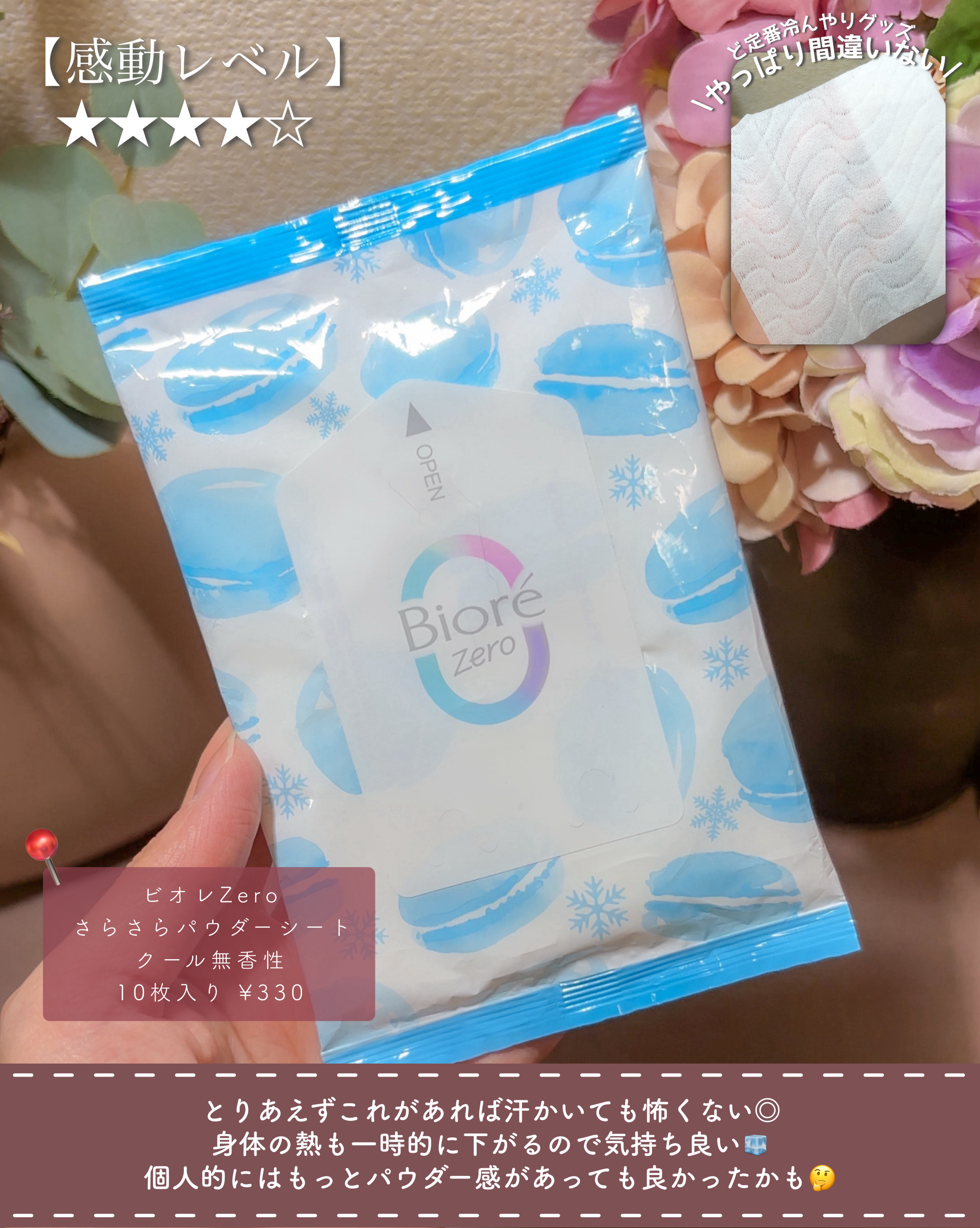 こちらは顔用のひんやりシートで、やさしくおさえるだけで汗でベタついたお肌をサッパリさせることができます😆 皮脂吸着パウダーと汗吸着パウダーが配合されているので、テカリも除去してくれます🙆♀️ シートは肌あたりの良い素材で出来ていて、水分が含まれすぎていないので、メイクを崩すことなく汗を抑えられます✨ メイクの上からこすらず、ポンポンとおさえるのですが、シートにメイクが全然付かないです😳 私は顔にすごく汗をかいてしまうので、ハンカチで汗をおさえた後にパウダーでメイク直ししていたのですが、メイク直しの最中もまた汗が止まらず…というのを繰り返していました😂 こちらのシートは清涼感があり、顔がひんやりするので使った後も汗をかきにくいです!! シートで汗をおさえながら保湿もすることができるので、その後に使うパウダーも浮きにくいです👀