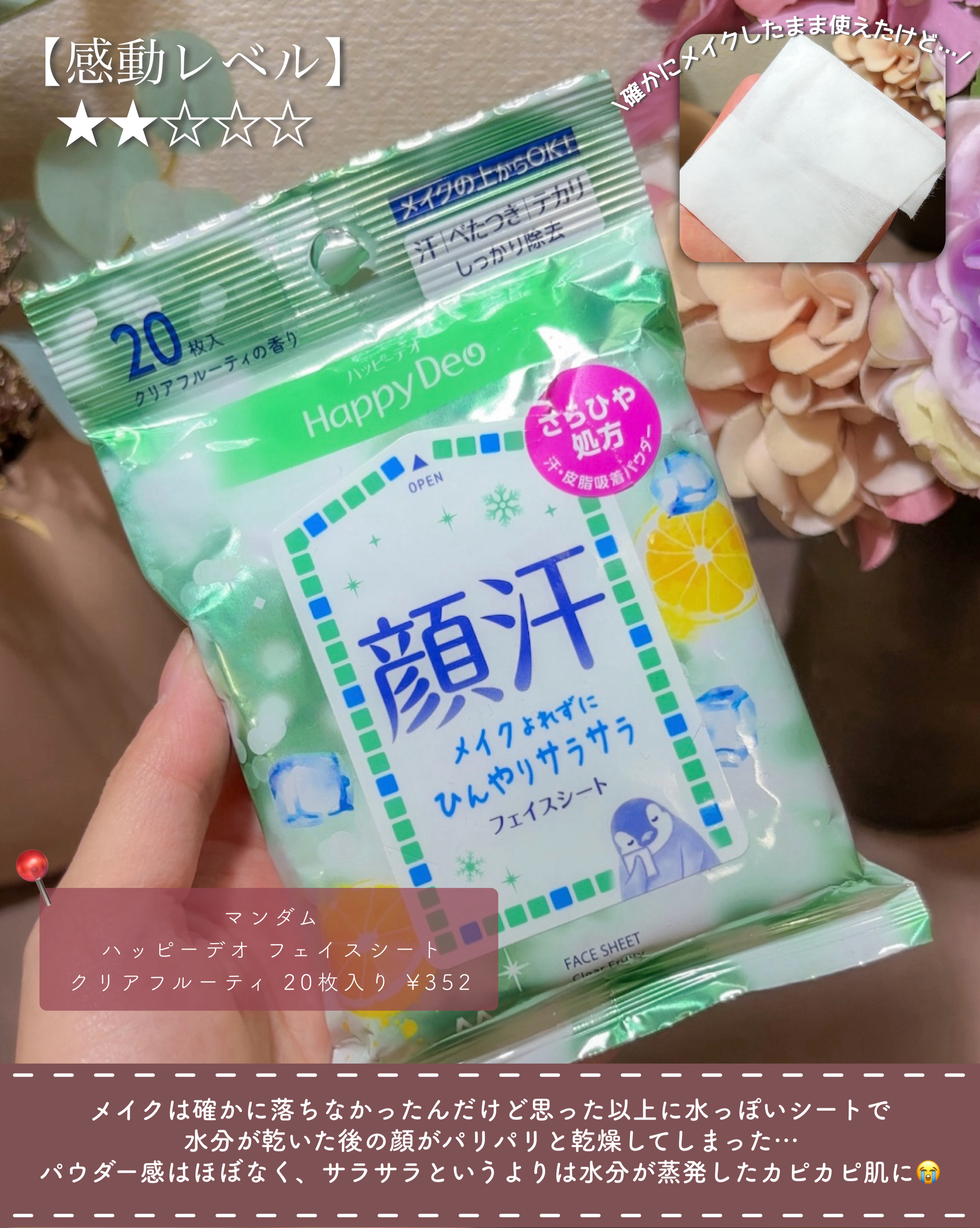 【マンダムハッピーデオフェイスシート】内容量:20枚入✰︎クリアフルーティふと撮りためた写真を見ていて気づいた…私なぜこれをレビューしてない!!セルレで100円前後で買った顔用の汗ふきシートパケにでっかく『顔汗』って書いてあって、持ち歩くのち...