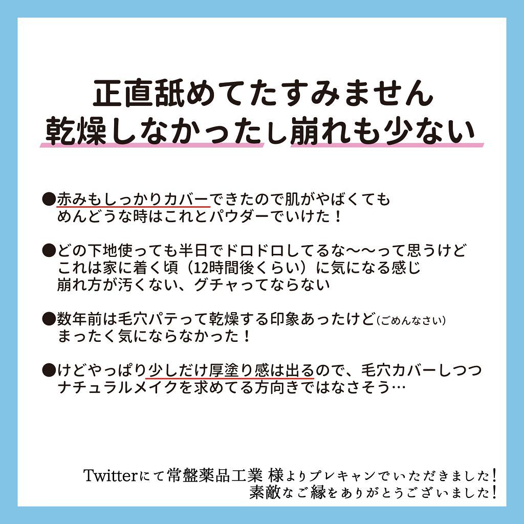 👍CCクリームの割にカバー力あるSPF50+PA++++👎崩れやすい(めっちゃマスクに付く😭)ファンデと比べたらカバー力低い...