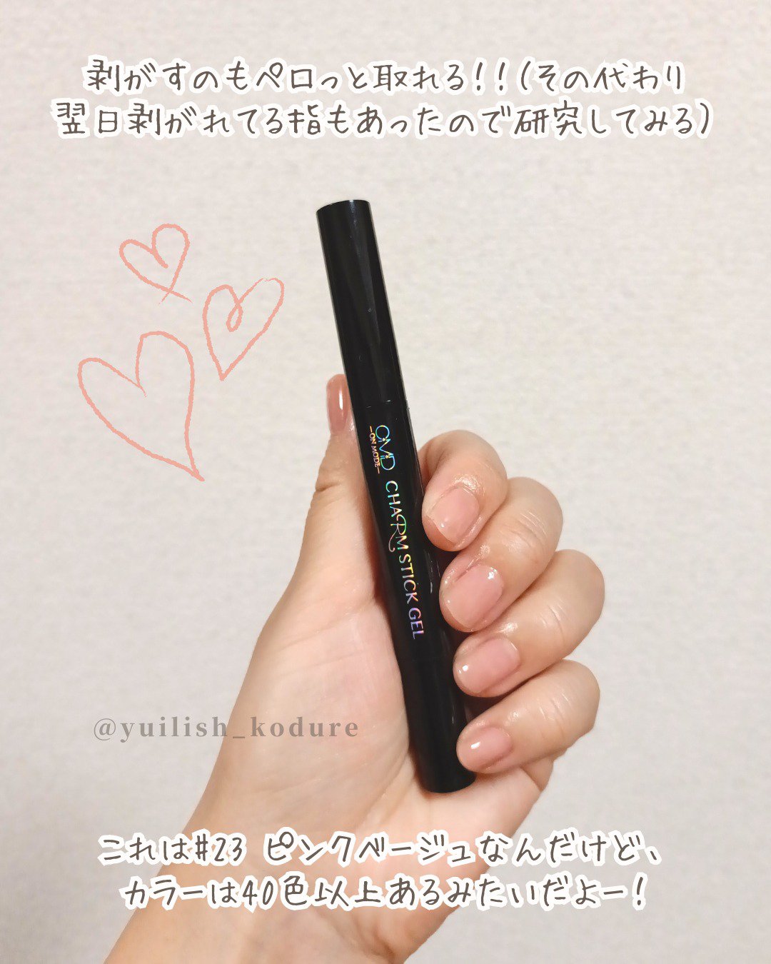 チャームスティックジェルはワンカラー苦手な人にすっごくおすすめ!私がそれなのですがムラになったりせずキレイに塗れるよ! ノンワイプだからライトがあればこれだけで始められます。スティック型で繰り出すタイプなのですが、ジャータイプからブラシで取って塗るより簡単で初心者さんにもおすすめです。 ピンクベージュもグレージュもシアーなタイプなので塗りやすい。重ねる回数で色の見え方も変わるし本当に可愛いの!そして剥がすだけで簡単にオフ出来るのでマシンで削ったりリムーバーも必要なし!サロンでもセルフでもオフって以外と時間取られるし面倒って人にもおすすめ!失敗しても修正も楽なので気軽に挑戦出来るところもお気に入り。