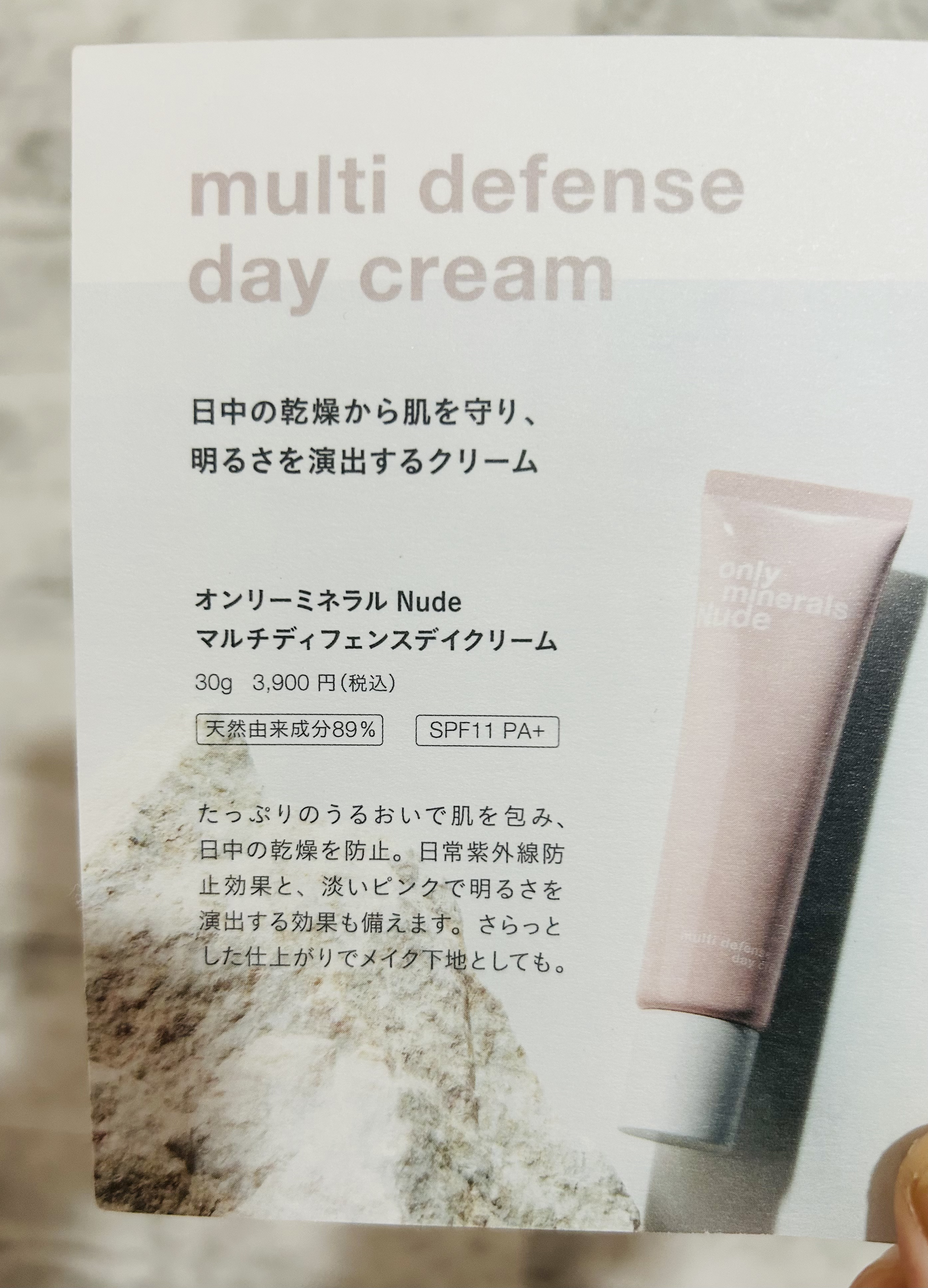ONLYMINERALS NudeマルチディフェンスデイクリームSPF11・PA+たっぷりのうるおいで肌を包み、日中の乾燥を防止。日常紫外線防止効果と淡いピンクで明るさを演出する効果も備え、朝のスキンケアの仕上げにふさわしいクリームです。もっちり感がありながらベタつきにくいテクスチャーで、メイク下地としても。天然由来成分89%みずみずしいテクスチャー。水分多めかな?と思いきや、塗るとしっかり密着します✨ラベンダーのような天然由来の香りがほんのりします。自然にトーンアップするんですが、肌が透けるような透明感が出ます!🫢✨これは感動🥺✨少し重めのテクスチャーですが、手の甲に塗っても小じわが目立たず肌が綺麗に見える♪ただ、仕上げにパウダーをはたくと、カスみたいなのがポロポロ出てきます💦そんなにベタベタするクリームではないけど、必ずフェイスパウダーをする私には使いにくいかも😢