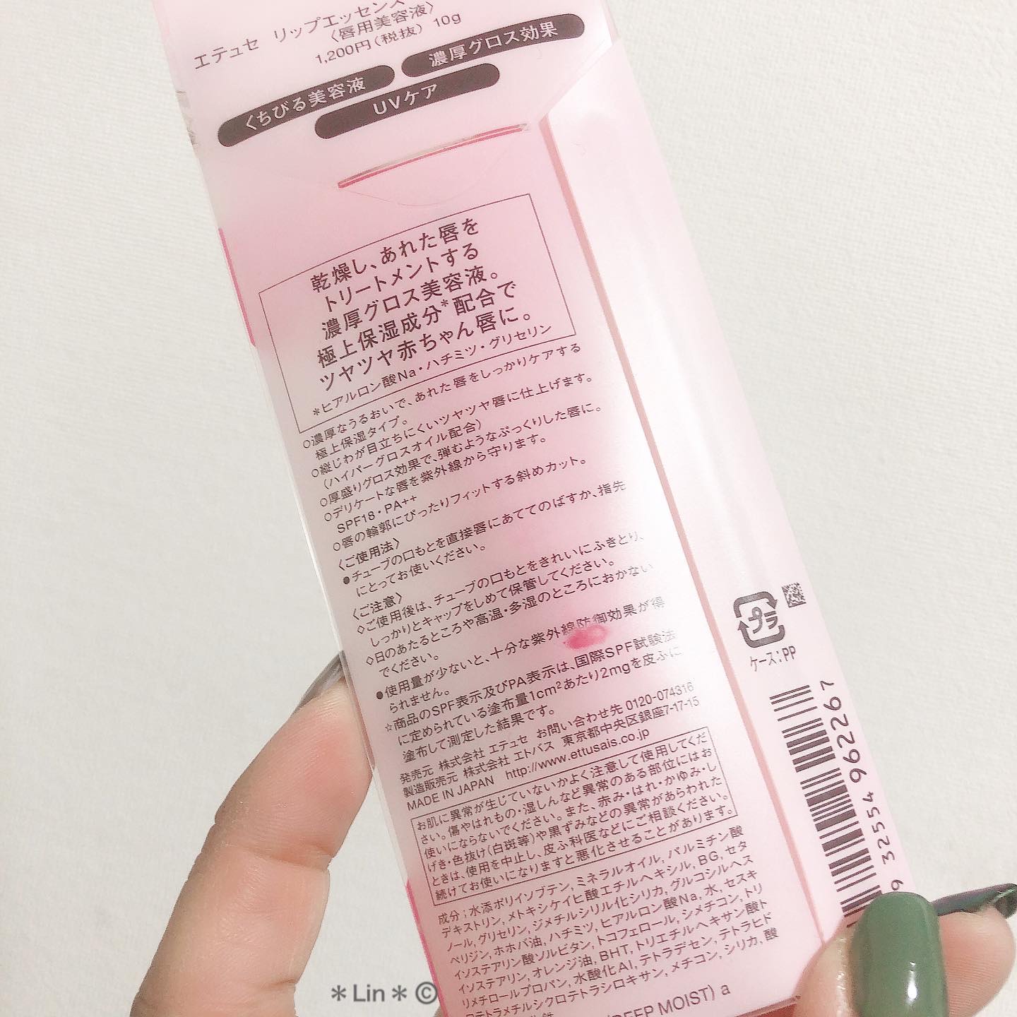 唇カサカサな私の救世主👄ettusaisリップエッセンスディープモイストa10gこちらは保湿力抜群なぽってり系リップです。乾燥し唇が割れて笑うこともできなくなった時購入しました。この商品で推したいポイントは・長時間保湿力が続くこと・日焼け止め効果があることです✨保湿成分としては…ヒアルロン酸Naハチミツグリセリンハイパーグロスオイル天然由来トリートメント成分(ホホバ油)など盛りだくさんです。そのためパックリと割れた唇も塗っておくと修復していきます。一晩で治るなどと言うわけではなく、完治まで保湿させて乾燥を防いでくれます。リップによってはぷっくりベタつく割に表面だけだったり、すぐ乾いてきたりするのですがこれは保湿時間が長いです。ただやはりペタついて髪がついてしまうこともあるため、・家のケア用として使用・化粧前に薄く仕込んでおく(UVケア)と言った使い方をしています。色は薄〜いピンクですが、言われてみれば少し血色感が増したかな?くらいです。この程度の色味なら学生さんも怒られないとは思います🤔(ツヤツヤがもうダメなのか…?)こんなに可愛いパッケージで、保湿力も抜群なので唇が荒れて痛い方にとってもお勧めします✨