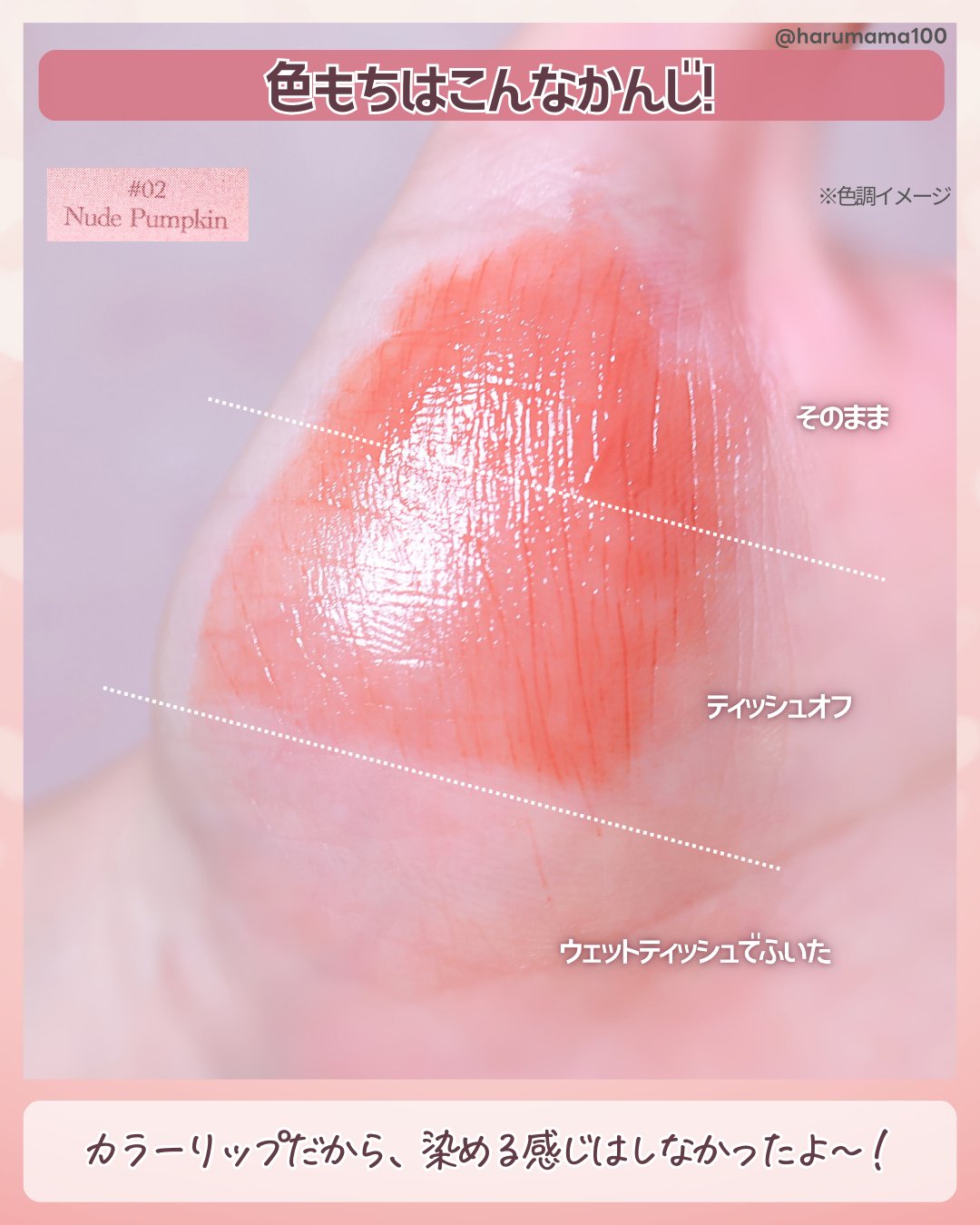 うるうるつやつやのむっちりリップが作れる! イエベ秋の私は薄めリップに若干苦手意識があるのですが、#02のヌードパンプキンは発色もちゃんとあって、鮮やかすぎずくすみすぎない粘膜色で使いやすいです。 ティントではないので色落ちはしてしまいますが、しっかり保湿もしてくれるので皮が剥けたり荒れたりの心配もなくカバンに忍ばせておくスタメンリップになりました◎
