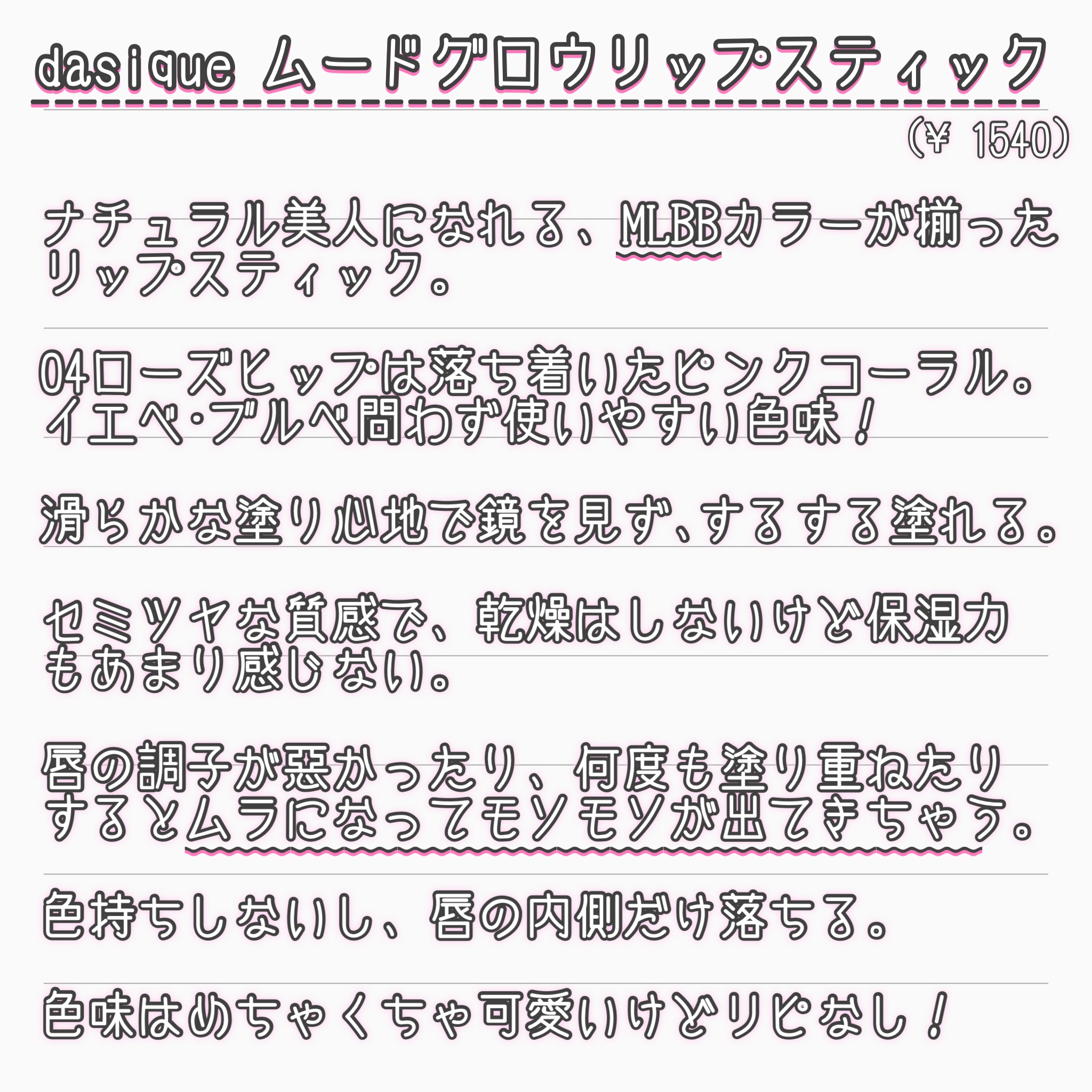 【使った商品】dasiqueムードグロウリップスティック04ローズヒップ【商品の特徴】保湿力がある【使用感】リップスティックなので塗りやすい【良いところ】無香料なところ