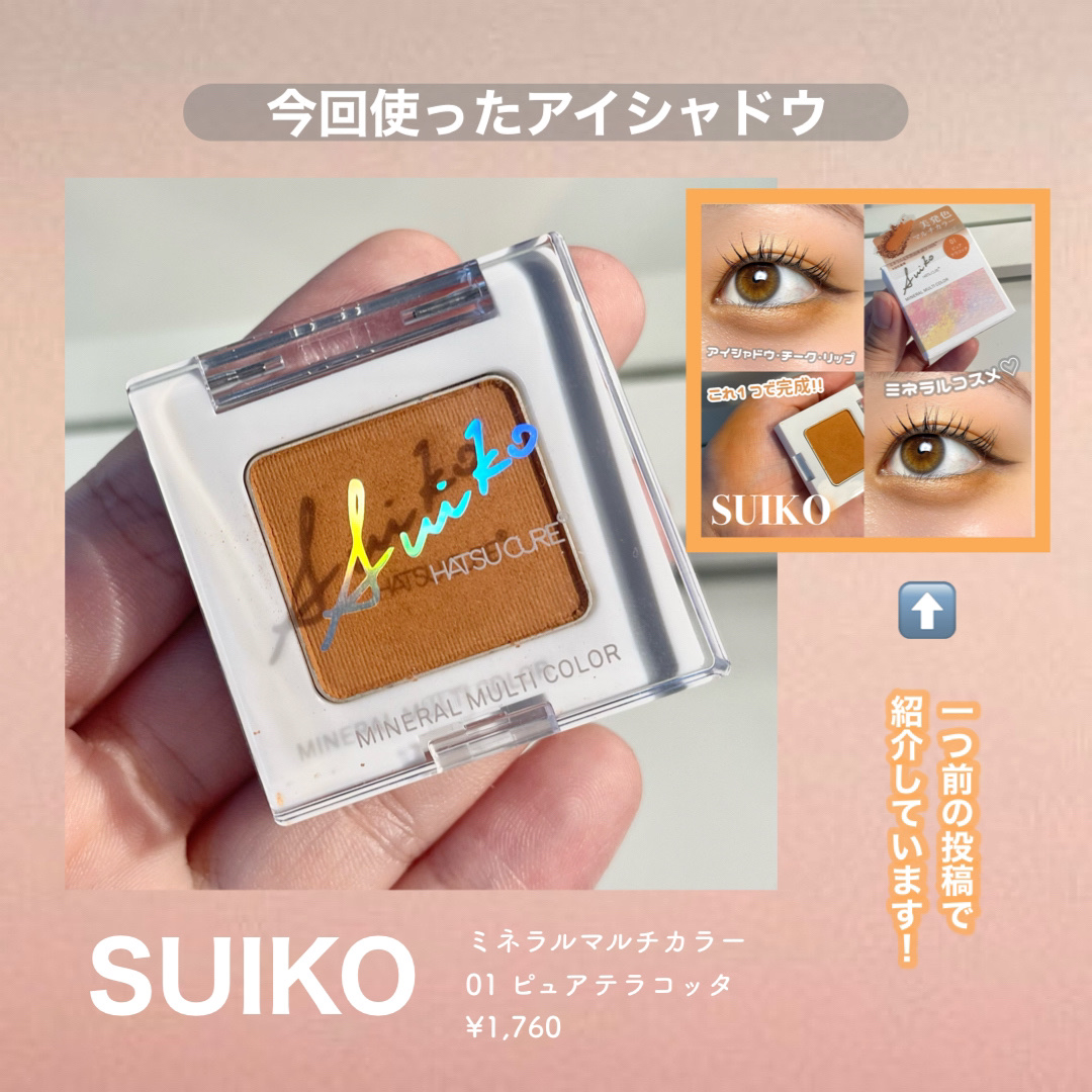 ヘアメイクアップアーティスト 牧野裕大さん監修 ブランド SUIKO ミネラルと天然由来成分にこだわったコスメ。保湿成分「クラゲコラーゲン」配合。 光と色で魅せる、ミネラルコスメ! パッケージも可愛いSUIKO 肌に映える絶妙なオレンジカラーでヘルシーな目元に ミネラルコスメとは思えず高発色なマットなカラーです。 アイシャドウとしてはもちろん、チークやリップ、シェーディングとしても使えます。 全部に使うと簡単に統一感が出せます。 石鹸オフ出来る所も◎ このお色、私にはちょっと難しかったです。 特にチークに使うと肌に赤みがある私にはくすんでしまう印象でした。 また他のカラーcheckしてみたいです。
