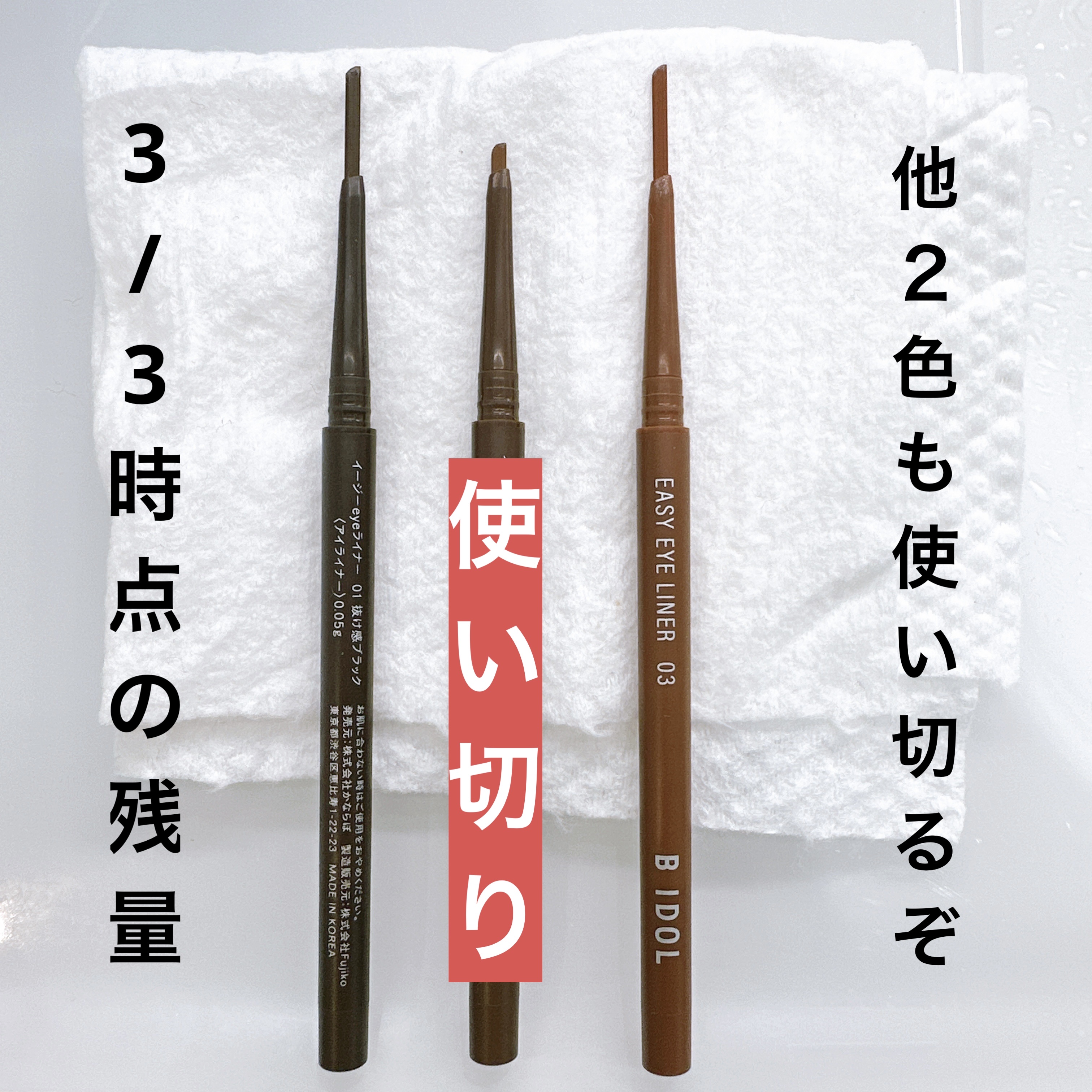 ◆bidoleasyアイライナー02純粋ブラウン(リニューアル前)目尻に使うと芯が硬くてバキボキ折れる事が多かった…ビーアイドル好きだけどこれはアイライナーとしては厳しいかな。終盤はアイブロウとして使用。使い切れて嬉しい!リニューアル後のも使ってみたいけどひとまず手持ちの使い切りを優先。他2色もきっとアイブロウとして使い切ると思う。#プチプラコスメ#アイメイク#コスメ紹介#ビーアイドル#使い切りコスメ