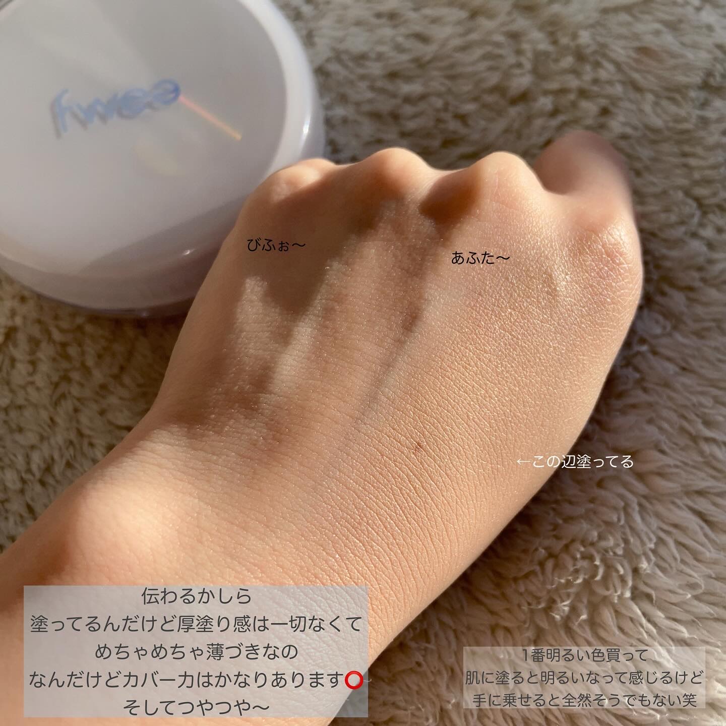 色が白いかなと思いつつ塗ってみると溶け込むようななじみの良さを感じました ツヤ感がきれいでカバー力 半端ないです。 明るめな質感も相まってフィルターを何重にもかけたような ツヤツヤ肌になれます。 しっとりしたファンデなので完全に冬向けです
