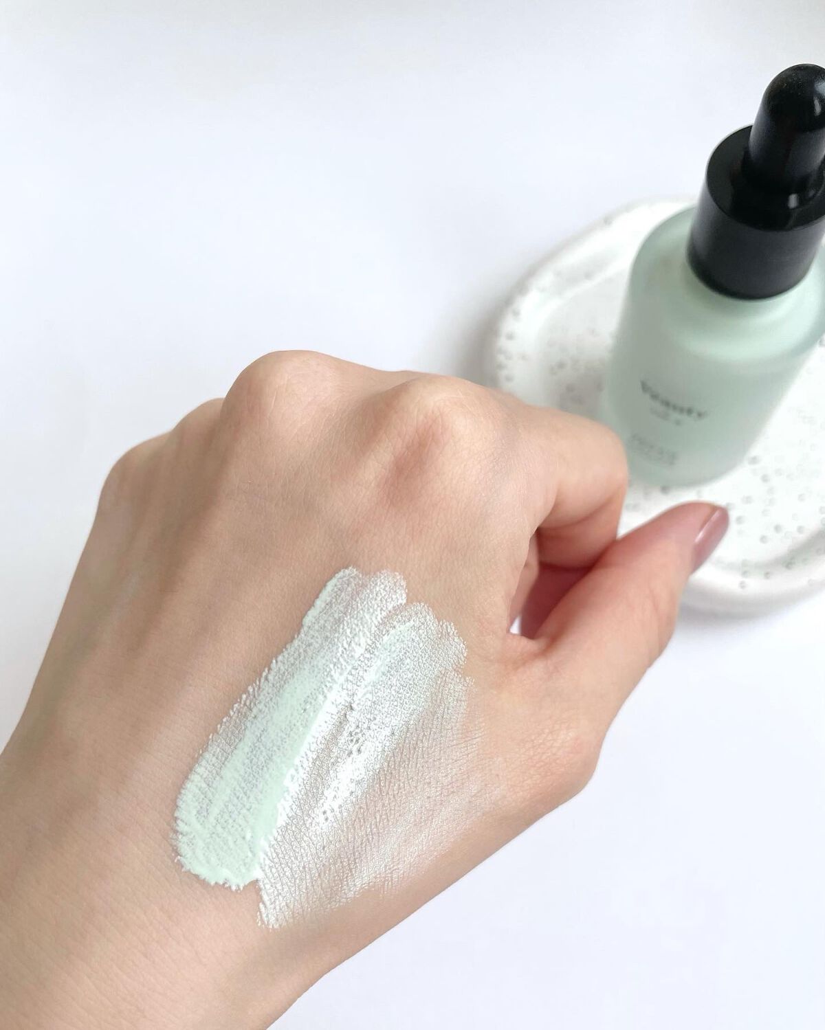 カラーコントロール効果のあるファンデーションで、今回はグリーンを使用しています。スポイトタイプになっていて、最後まで衛生的に使いやすく、出し過ぎの心配もないのが嬉しいポイントです。ぽたぽたっと手の上に出してみると、思った以上にしっかりグリーン...