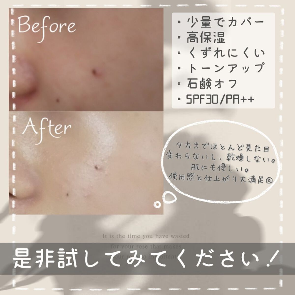実際使ってみて、ほんと程よくトーンアップしてくれてでも赤みはしっかり消してくれる💚 Greenの下地などは好きでよく使うけどこれは全体で見ると程よく、でも気になるところはしっかりカバーしてくれるのでおすすめ! 高保湿でしっとりしてるので冬まで使えるけど、ベタベタはしないのでオールシーズン使えそう! ただファンデーションって書いてはあるけど赤み以外の、そばかすとか毛穴のカバーはあんまり?なので下地として使おうと思います👍