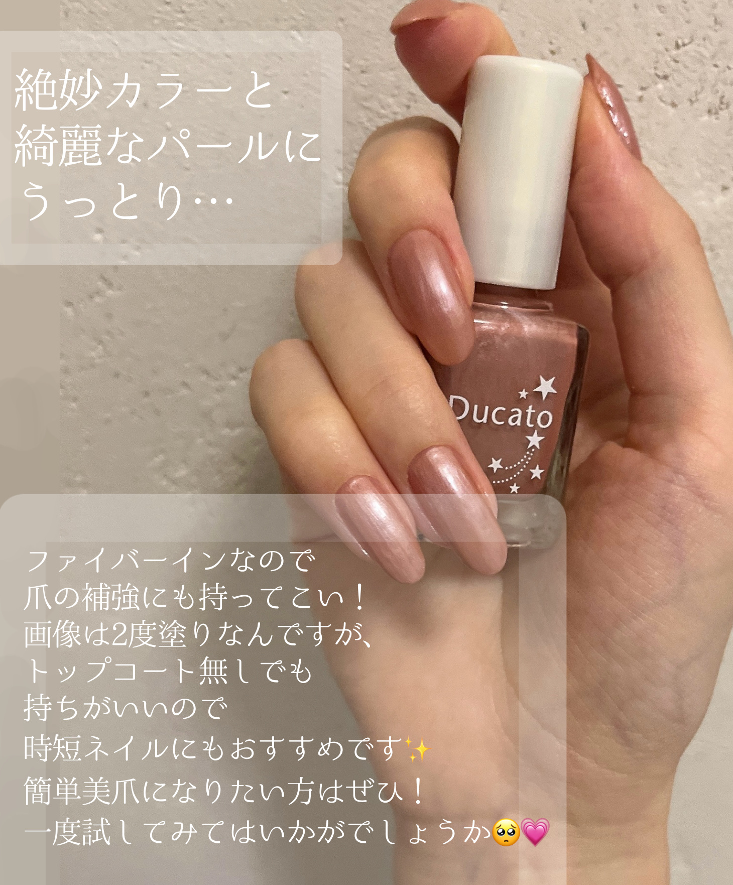 DucatoファイバーインハードナーEX『モカベージュ』お値段:825円(税込)こちら、個人的1番のオススメポイントはパールの綺麗さです💗✨パール系のマニキュアって、ムラになったり筋ができちゃったりしませんか?🥲でもこのシリーズは適当に塗って...