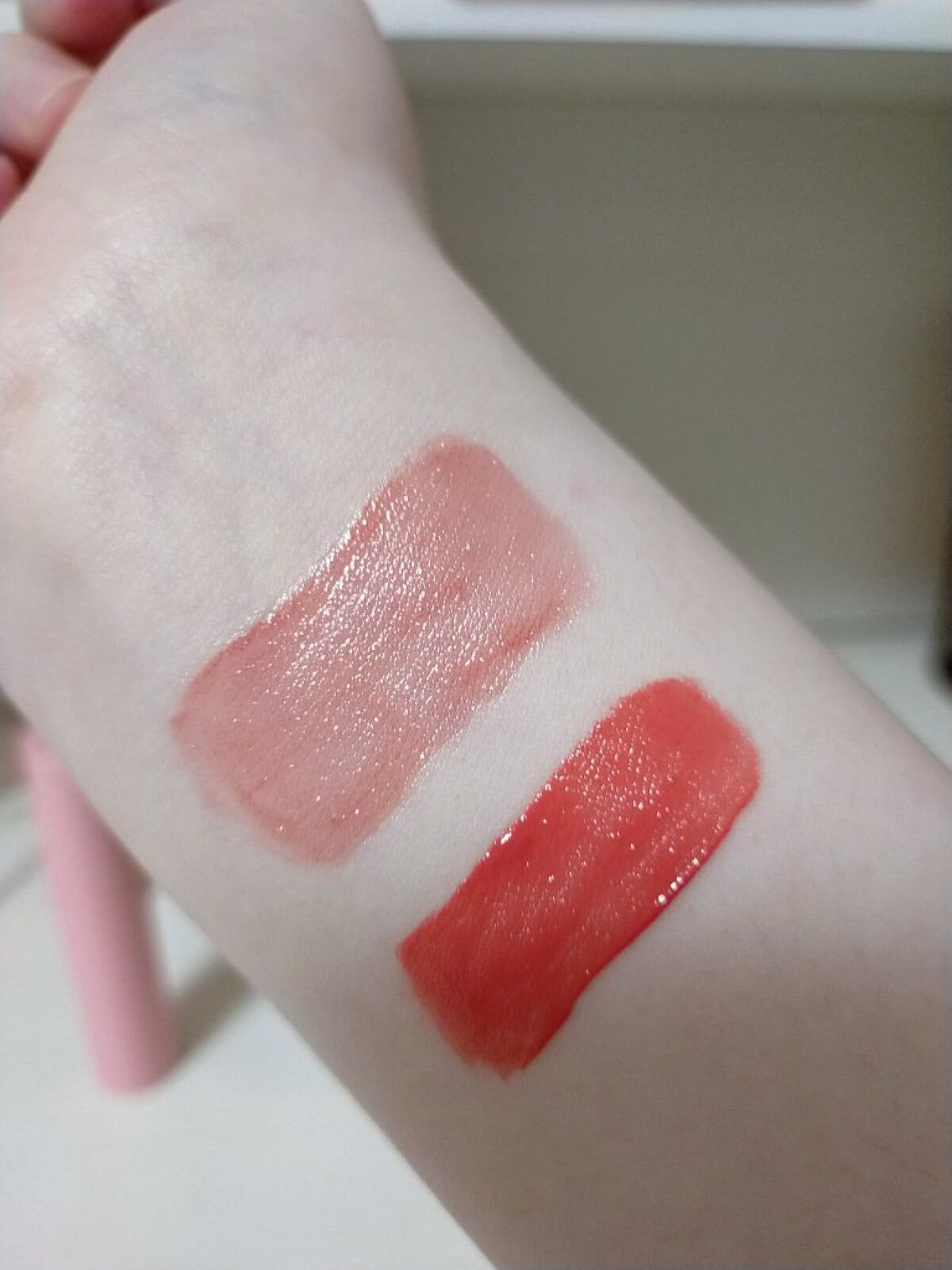 まず、A’pieuのジューシーパン スパークリングティントBE02おねだりグアバを全体に塗ります。 淡いベージュのベースにキラキラ〜な、ラメ入りのリップです。 これだけでも可愛いんですけど…若干物足りないなぁって時に、フォレンコスタトゥーグラスティント03アザレアを唇の中央にポンポンと塗り足してます。 仕上がりは華やか?な明るいピンクコーラルで、夏におすすめです🥳 フォレンコスのタトゥーグラスティントだけを塗ると、ティントしすぎて…落とすの面倒くさいので何かベース塗ったら良いんじゃ??と思ってはじめた組み合わせです。 軽くティッシュオフすると、A’pieuのラメが目立って可愛いです。