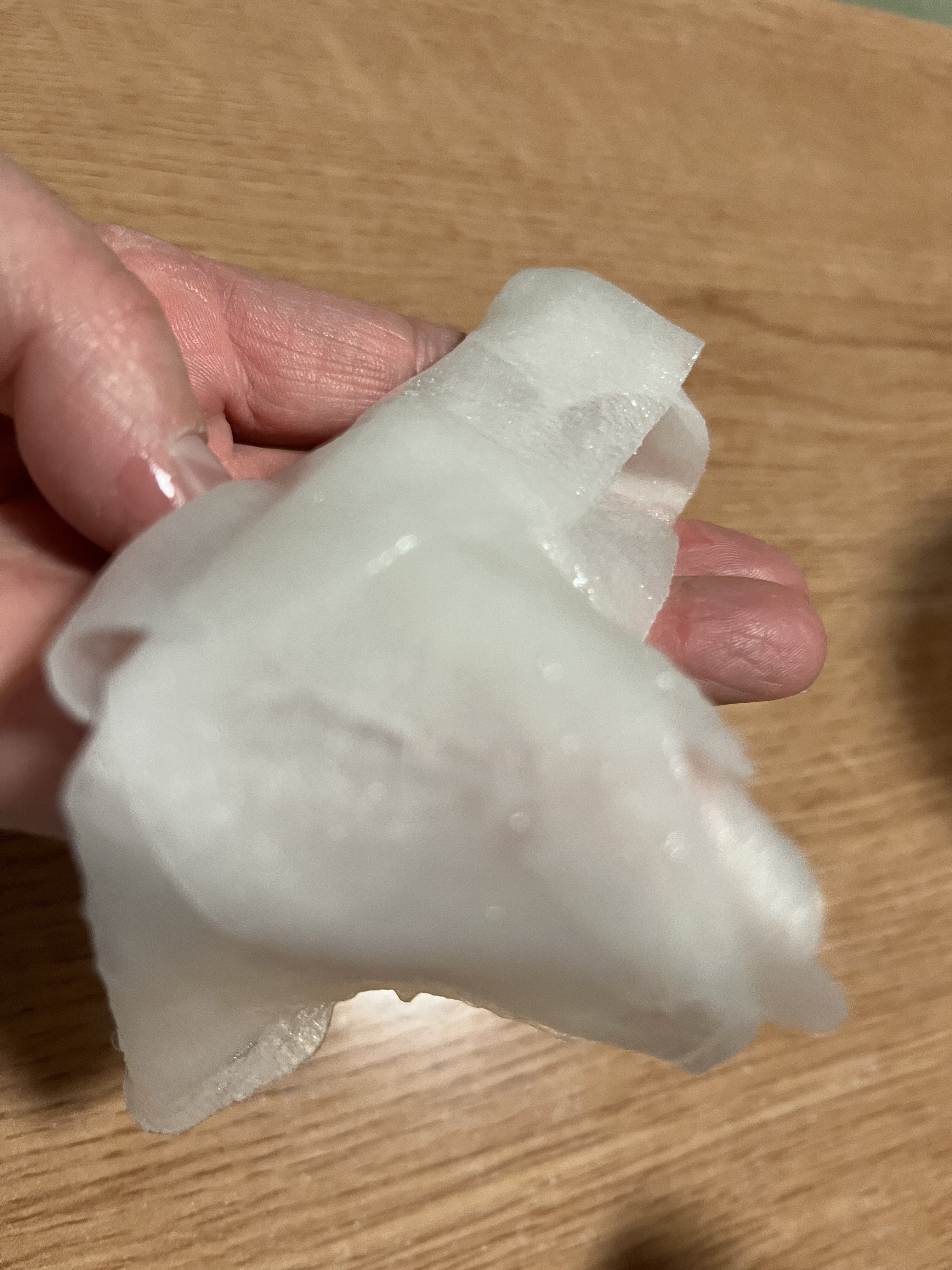 シートマスクのシートが厚めでしっかりしています。それでも美容液がたっぷりと含まれているので、顔にしっかり密着します。美容液も滴るくらいに含まれてるのでマスクを外すと、顔に付着した美容液がたれてくるほどでびっくり‼️しっかりと手で浸透させるように顔に馴染ませないとダメなくらい。目と鼻の空いてる部分も適度でちょうど良い。シートの厚さは、今まで使った中で一番厚いかもです。