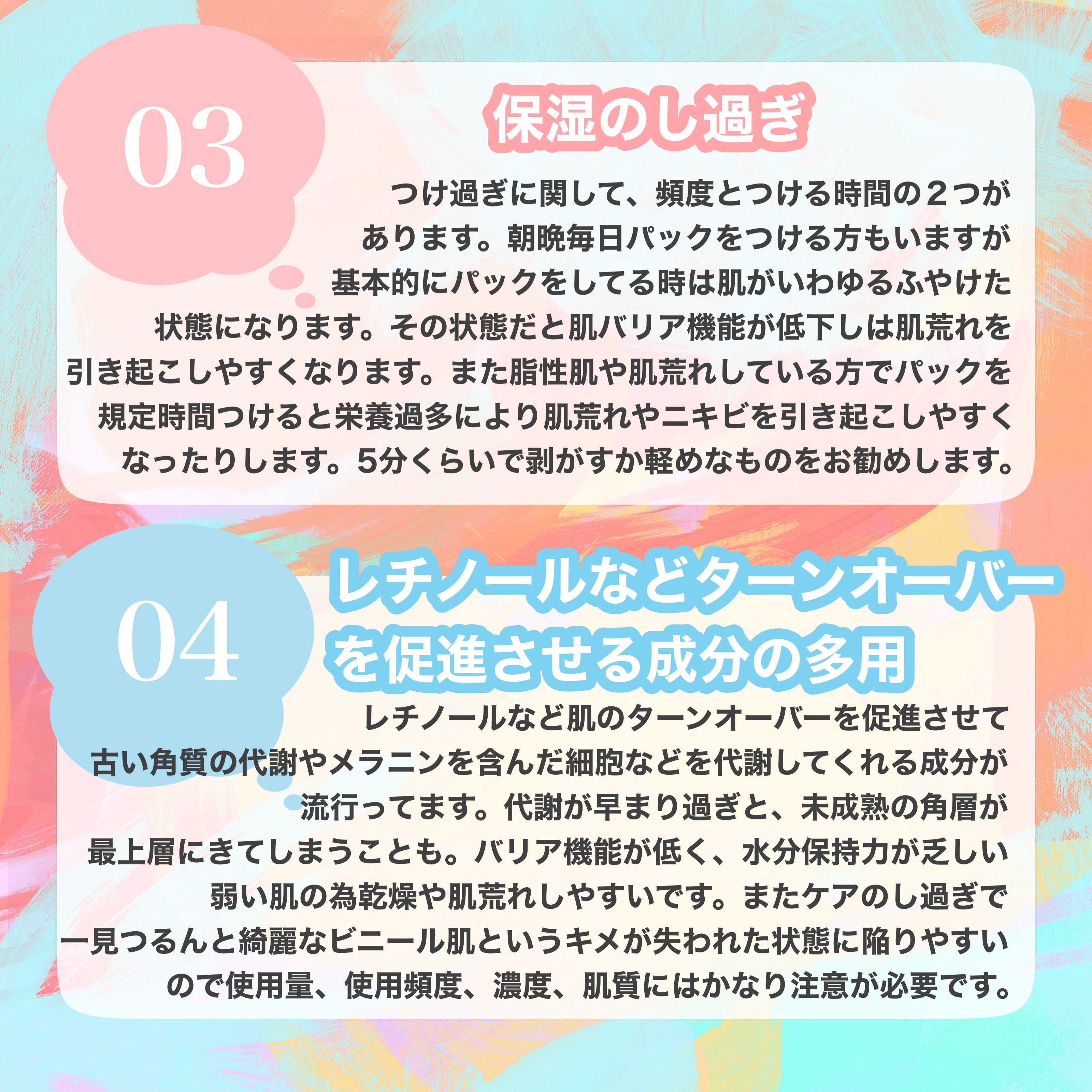 肌ケア頑張ってる人が陥りやすいNGケア🤦♀️頑張ってるあなたが損してほしくないから私の失敗体験も含めてお届け🫶頑張るあなたは美しい💪🧡🧡01:刺激を感じたまま化粧品を使用する02:パックのつけ過ぎ→パックでベタつく人はもっと軽めのデイリーパックがおすすめ。VTのシカスージングマスクやクオリティファーストのオールインワンシートマスクなど03:保湿のし過ぎ04:レチノールなどのターンオーバーを促進させる成分の多用05:毛穴ケアのし過ぎ06:洗顔ブラシを使う07:拭き取り過ぎ08:絶対に乳液を塗る09:枕、パフやブラシをこまめに洗わない→最近動物毛以外のブラシやパフを牛乳石鹸で洗うとキレーーーーに落ちるのでハマってます。おぬぬめ!✌️✌️✌️✌️10:肌悩みを化粧品だけでなんとかしようとするとにかくなんでもしすぎるのはよくないのです…肌にあれこれしすぎるのもよくない…し過ぎていいのはほんと紫外線対策☀️だけです…(これまじ)美容意識高い人は人一倍肌なやみをコンプレックスに感じやすいけども時にはこういったことやってしまってないかな?と振り返るのも大切。皮膚の角層はラップ一枚ぶんほどの薄さしかありません。そこに入る成分の量も水分の量も限られてますし、当たり前に刺激や圧力なんかにも弱いです🙅♀️今一度赤ちゃんのお尻🍑をケアするように一喜一憂せず毎日コツコツできるケアをほどほどに続けていきましょう!一人で困らず、時にはお医者さん(皮膚科、美容皮膚科など)に頼るのだって必要かもしれません。可能性を狭めず追い込み過ぎずやっていきましょうね😊🧡#メイク初心者 #スキンケアルーティン#スキンケアレポ#スキンケア_毛穴#スキンケア_ニキビ