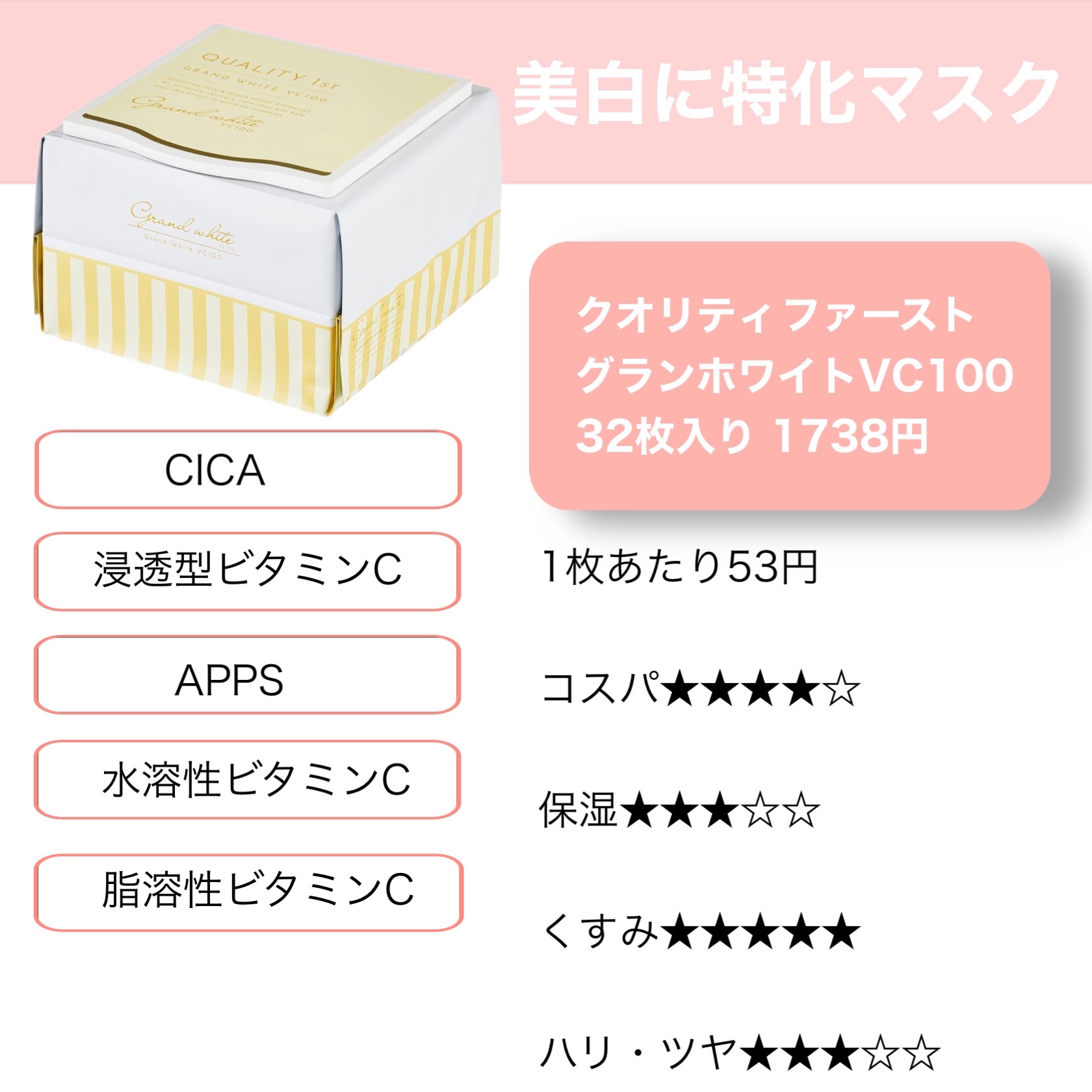 【クオリティファースト】グランホワイトVC100シートは分厚めで重ための美容液クリームが入ってるから保湿感は強めホワイトだけどあんまり効果は感じなかったかも薄いシートの方が好みだしグリセリンが強い感じしたからリピ無しかな〜