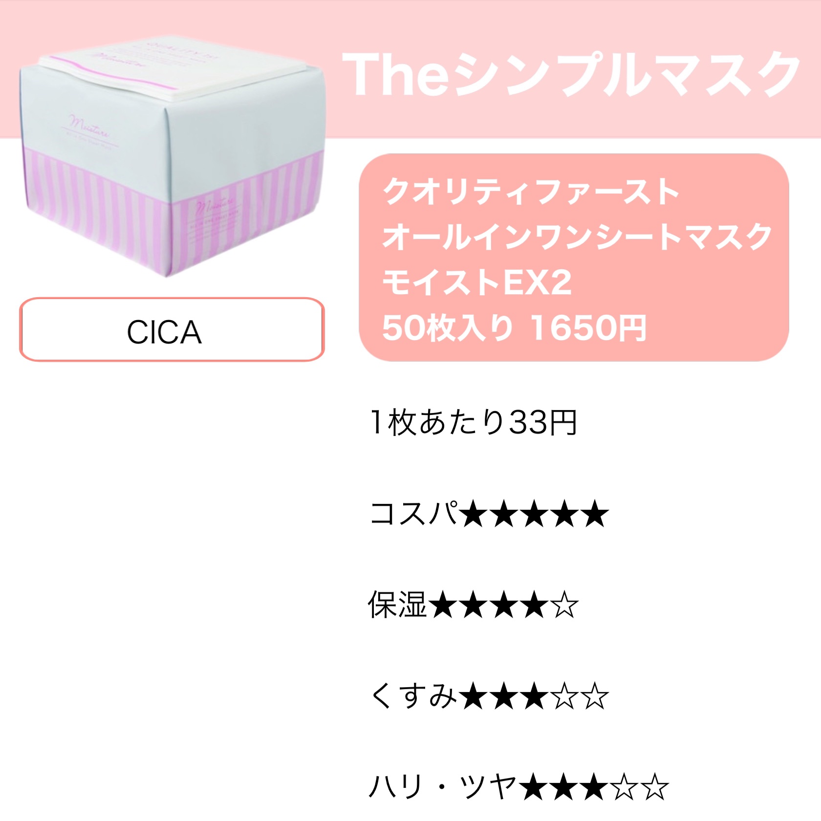 大人気コスパ抜群シートマスクを徹底比較‼︎/クオリティファーストオールインワンシートマスクモイストEX2 50枚入り1650円クオリティファーストオールインワンシートマスクセンシティブマスク 32枚入り1738円クオリティファーストグランホワイトVC100 32枚入り1738円今美容のカリスマ的存在として注目されているMEGUMIさん。本当にお肌がツヤツヤで綺麗ですよね。そんなMEGUMIさんの著書で紹介されている美容法が「毎日朝晩シートマスクをする」というものです。やはり美肌への近道は保湿からですよね。私は基本的に朝は家事をしながらシートマスク、夜は精製水パックをしています。この時重要なのはパックをする時間‼︎私は3分〜5分と決めています。また、毎日使用するシートマスクは美容成分たっぷりなスペシャルなものではなく、保湿に特化したものを使用するようにしています。この美容法を続ける上で1番気になるのは、やっぱりコスパですよね。でも、私はエタノール過敏かつ敏感肌なので、成分やマスクの性状にも気をつけないといけない。そんな時、コスパ抜群かつ私の肌でも荒れないシートマスクを発見しました◎それが「クオリティーファーストのシートマスク」です。今回はそんなクオリティーファーストの大容量シートマスク3種類を比較してみました。この投稿が少しでもお役に立てれば幸いです☺️最後までご覧いただきありがとうございました🙌#クオリティファースト#シートマスク#比較#保湿#乾燥肌_敏感肌#美容法#MEGUMI