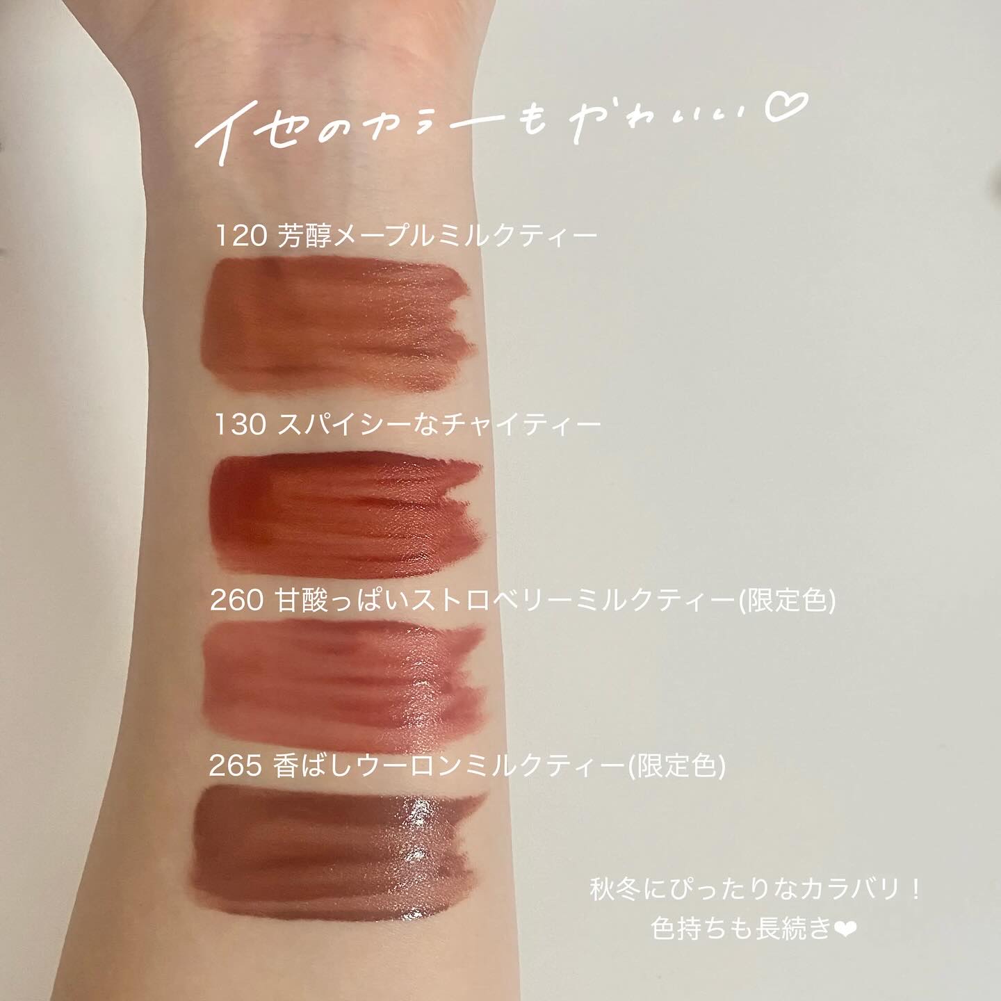 メイベリンの#落ちないリップ*1から秋冬限定色が登場!!メイベリンニューヨークSPステイヴィニルインク1991円(税込)むちっと濃密なパールミルクティーリップ!限定色はこの2色♡265香ばしウーロンミルクティー260甘酸っぱいストロベリーミルクティーこの2色はミルクティーの香りがするの〜!ツヤ感もありつつ、 色もちのいい仕上がりだったよ〜!お気に入りは260♡ピンクベージュがかわいい〜よりマットに仕上げたい時はメイベリンニューヨークSPステイマットインクがオススメ!ボトルの色が見たまま発色!よりマット仕上がり&高発色!8月27日~ロフトで順次先行発売9月13日~全国のバラエティストア、ドラッグストアおよびオンラインショッピングサイト(一部取り扱いのない店舗がございます)で購入可能だよ〜!色持ちいいリップ欲しい人はぜひチェックしてみてね〜!*1着用16時間を想定した最長の場合において。メイクアップリムーバーで落とすことが可能です。メイベリンニューヨーク調べ。個人差があります。#PR#メイベリン#メイクアップ#パールミルクティーリップ
