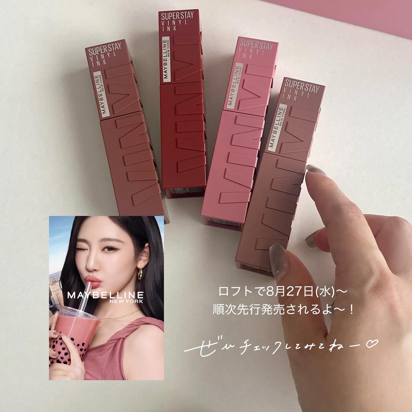 MAYBELLINEから落ちないリップ*¹で人気の「SPステイヴィニルインク」「SPステイマットインク」シリーズから新色が登場!⠀⠀限定2色は肌馴染みの良いベージュベースでどちらもミルクティーの甘い香りがします4色ともツヤっと仕上がって色持ち...