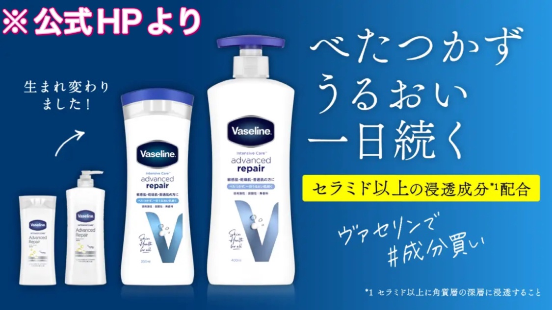 こんにちは。みち🫡です。今日はボディクリームを紹介します🧴ヴァセリンアドバンスドリペアボディローション200ml、400mlオープン価格です。保湿力もあるのに、ベタつきが少ない超!優秀!ボディクリームです。私、保湿力は求めるけどベタベタが苦手...
