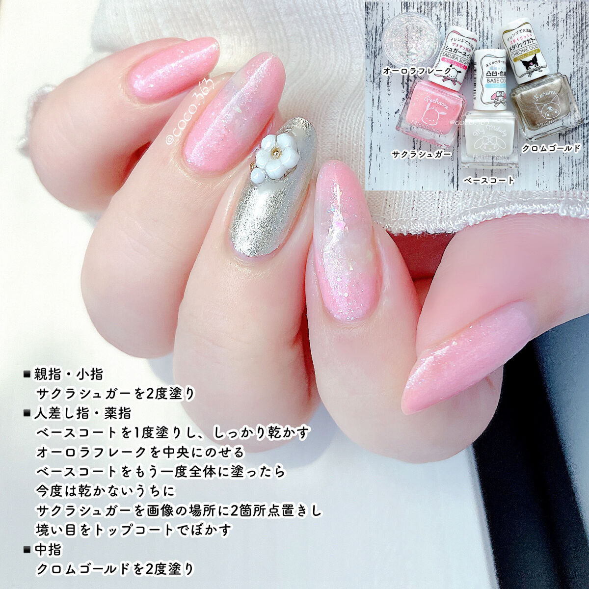 ポチャッコちゃんが載っており サンリオ好きさんはたまらないのでは?!🤤🤍 サクラシュガーってお名前から可愛いです♡ キュンキュンするような可愛らしい桜色に キラキラ輝く甘〜いお砂糖のようなラメが入っております🪄 春にぴったりの可愛らしいネイルです♡