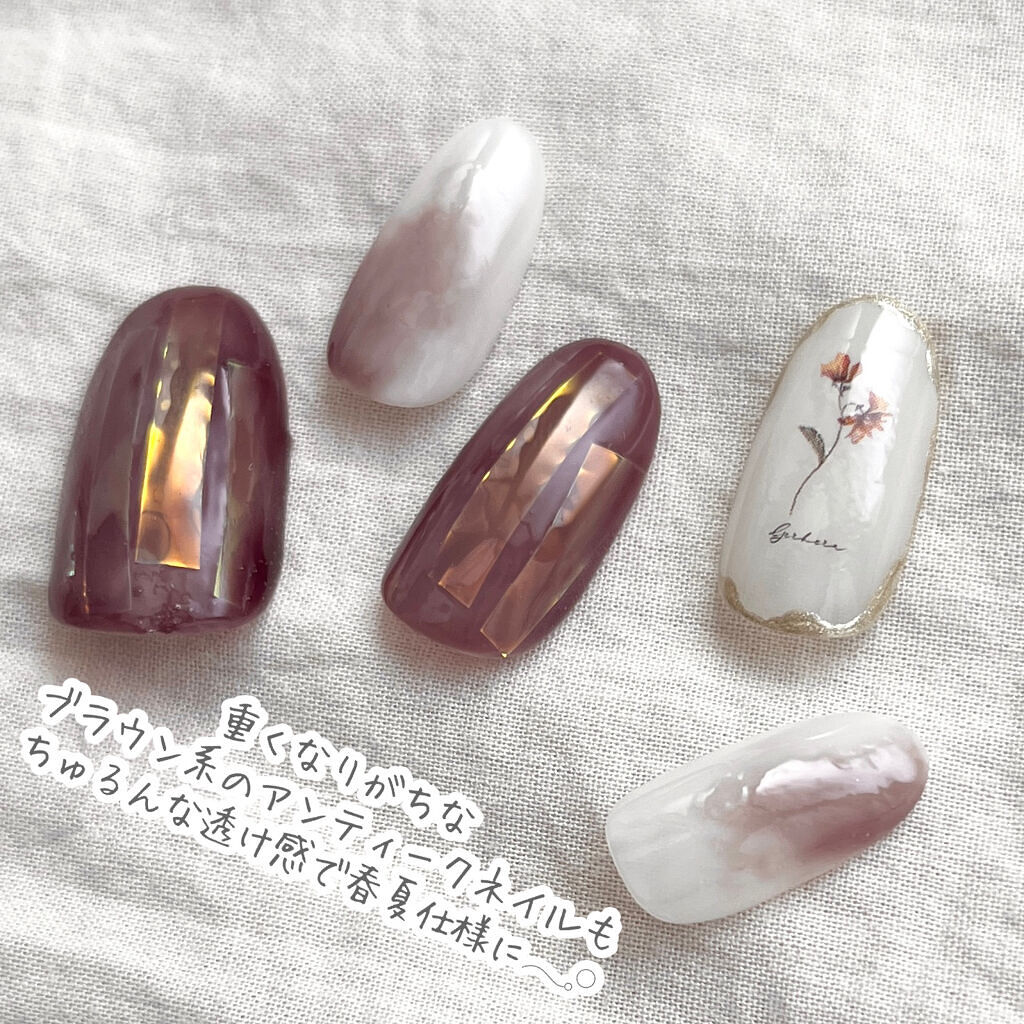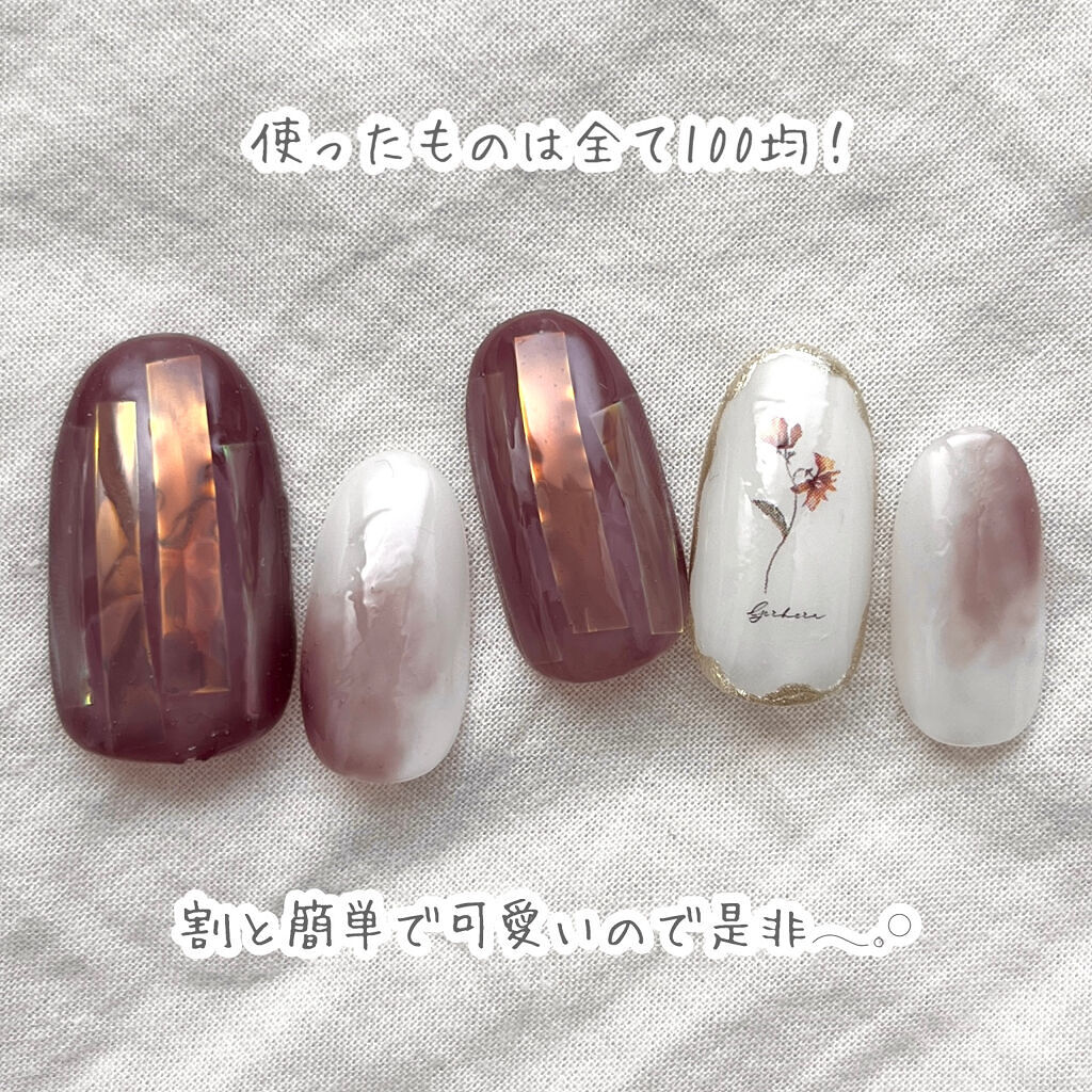all100均…❤︎/透けブラウン×オーロラフィルムが可愛すぎる!ちゅるんなアンティークネイルをご紹介します𓂅˒˒𓎂今回使用したもの𓎂・ダイソーフレンドネイル 1-9セピアコート 1-11クロムゴールド・キャンドゥしずくネイルポリッシュ 06シアーホワイト・キャンドゥしずくウォーターネイルシール 植物図鑑・セリア オーロラフィルム (ぱっと見青っぽく見える方!)以上です!親指.中指はシアーホワイトを1度塗り!縦長に切ったオーロラフィルムを貼る!オーロラフィルムは気持ち台形に切って▽▲▽←こんなふうに組み合わせるとgood!シアーホワイトをもう1度重ね塗り!からのセピアコートを2度重ね塗り!人差し指.小指はシアーホワイトを2度塗り!セピアコートを人差し指は左下小指は右上の外側からさっと乗せて境目をトップコートで素早くぼかす!しっかり濃淡があった方がいい感じなのでぼかしすぎたり濃淡が弱い場合は濃くしたい部分だけ軽くセピアコートを乗せて同じように境目をトップコートでぼかす!薬指はシアーホワイトを2度塗り!中央にネイルシールをON!クロムゴールドでゆらゆらさせながら縁を囲む!秋冬っぽい印象になりがちなブラウン系のアンティークネイル…透けブラウン×オーロラフィルムでちゅるんっと仕上げると春夏仕様に大変身!しかもめちゃめちゃ可愛い…❤︎ちょっとぼかす工程はあるけどセピアコートは透け感強めなのでぼかす時の難易度も低め!使ったものもall100均で全体的に割と簡単で可愛く出来るので気になった方は是非真似してみて下さい〜!少しでも参考になればと思います!最後までありがとうございました!#DAISO#フレンドネイル#ダイソーネイル#100均#100均ネイル#百均#百均ネイル#サンリオネイル#セピアコート#キャンドゥ#しずくネイルシール#しずくウォーターネイルシール#しずくネイル#セリア#ネイルシール#春ネイル#オーロラフィルム#氷ネイル#囲みネイル#もやもやネイル#ダイソー#ネイルチップ#セルフネイル#ネイル#マニキュア#ネイルポリッシュ#本音レビュー#一目惚れコスメ
