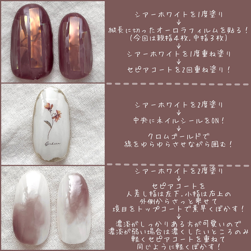 透けブラウン×オーロラフィルムが可愛すぎる! セピアコートは透け感強めなのでぼかす時の難易度も低め! 全体的に割と簡単で可愛く出来るので気になった方は是非真似してみて下さい〜!