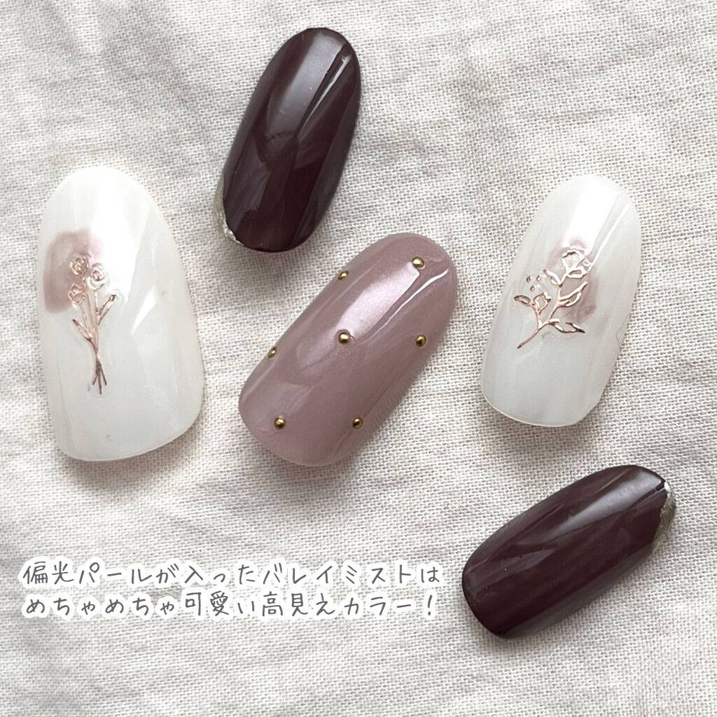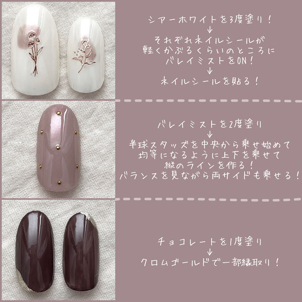 全て100均で出来る簡単可愛いネイルデザインをご紹介します…! シアーホワイトを3度塗り! バレイミストを割と適当にON! ネイルシールを貼る! チョコレートを1度塗り! クロムゴールドで一部ゆらゆら縁取り! バレイミストを2度塗り! 半球スタッズでドットにするんだけど半球スタッズを中央から乗せ始めて上下を乗せて縦のラインを先に作る! 偏光パールが入ってたバレイミストはめちゃめちゃ可愛い高見えカラー! シアーホワイトとバレイミストが割と透け感のある感じでブラウンだけ透け感弱めなんだけどブラウンを1度塗りにそのほかを重ね塗りする事で全体の透け感をそろえています! 使ったものは全て100均!とっても簡単に可愛く出来るので気になった方は是非真似してみてください 少しでも参考になればと思います!