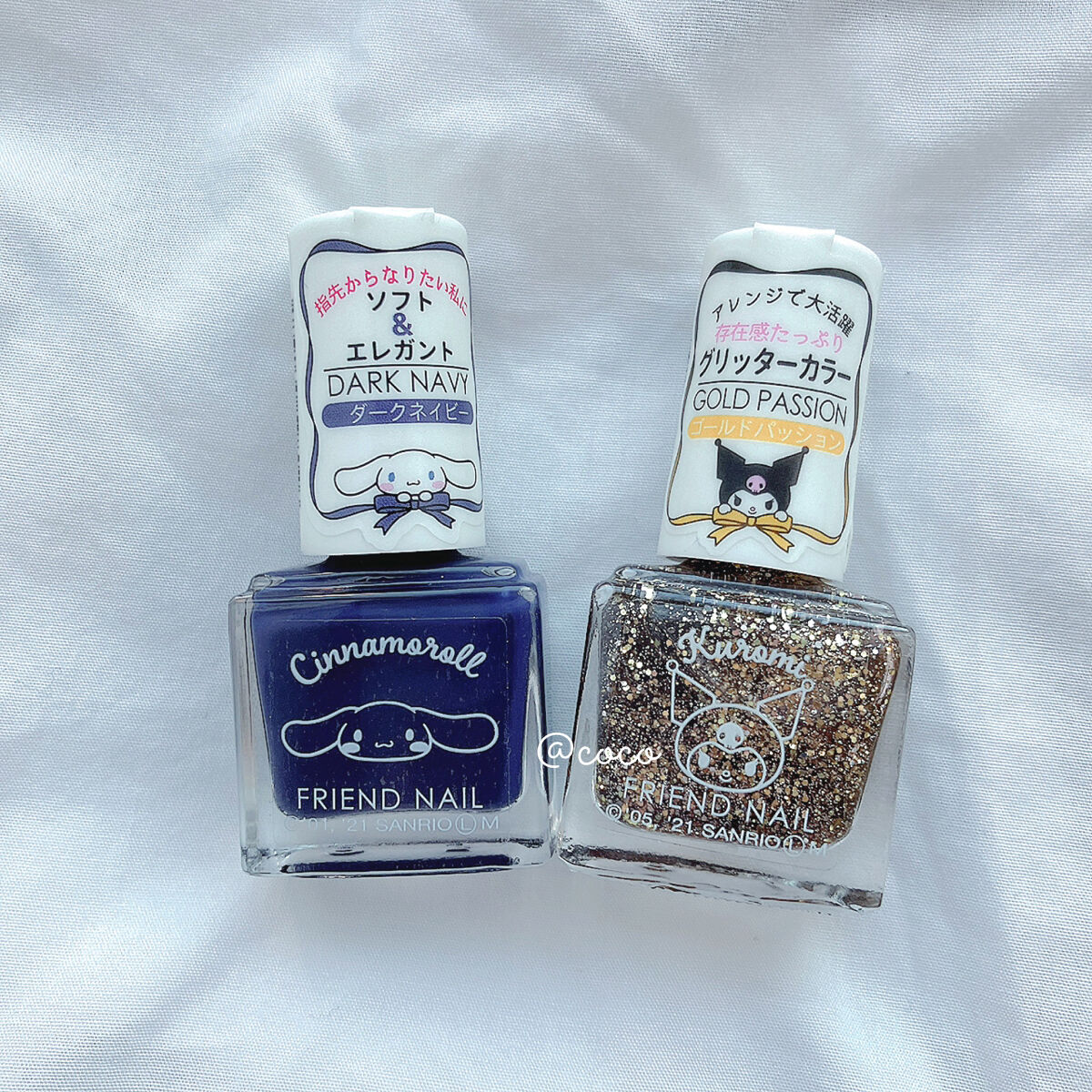 クロミちゃんデザインのボトルがかわいい!! クロムシルバーは、ぎっっっしり詰まった細かいラメ。 細いブラシを使えば、線を引くこともできる。 これで100円ならかなり良いと思う使い心地。 色んなサンリオキャラのデザインでカラバリ豊富。