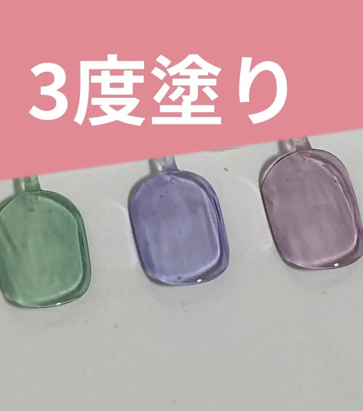 本当にシロップのような液体の感じです! サラサラした液体で塗りやすかったです シロップっぽいので透明感が出て綺麗✨ カラーバリエーションが豊富で他の色でもあったのでお好みの色でシロップネイルを出来ると思います💅★* 重ね塗りをすることで色味の調整をすることが出来るのでめちゃくちゃ良い… 1度塗りではほんのりですが、2度塗りで結構色が乗るので楽でした 筆がほんの少し広がり気味ですが、そこまで塗り辛いとかでは無いので、お手軽価格で試せるのでとてもいいと思います🙆♀️