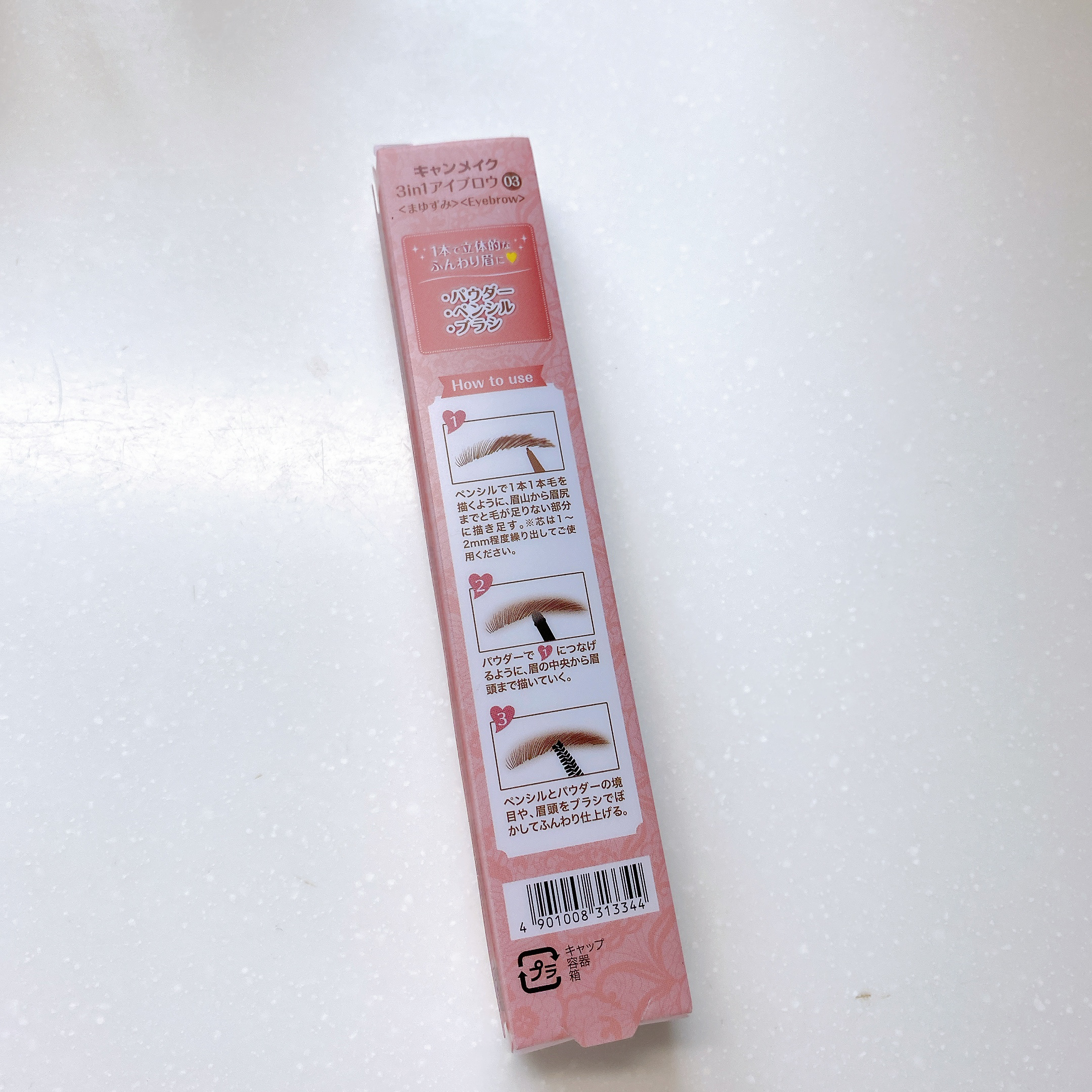 キャンメイクの商品「3in1アイブロウ」¥990円 プチプラで1,000円以下 これ1本で3役♡ペンシル・パウダー・ブラシ 持ち運びも楽ちんで細めのペンシルだから描きやすい コスパ◎だと思っていたのにペンシルの無くなりが早いかなと感じた