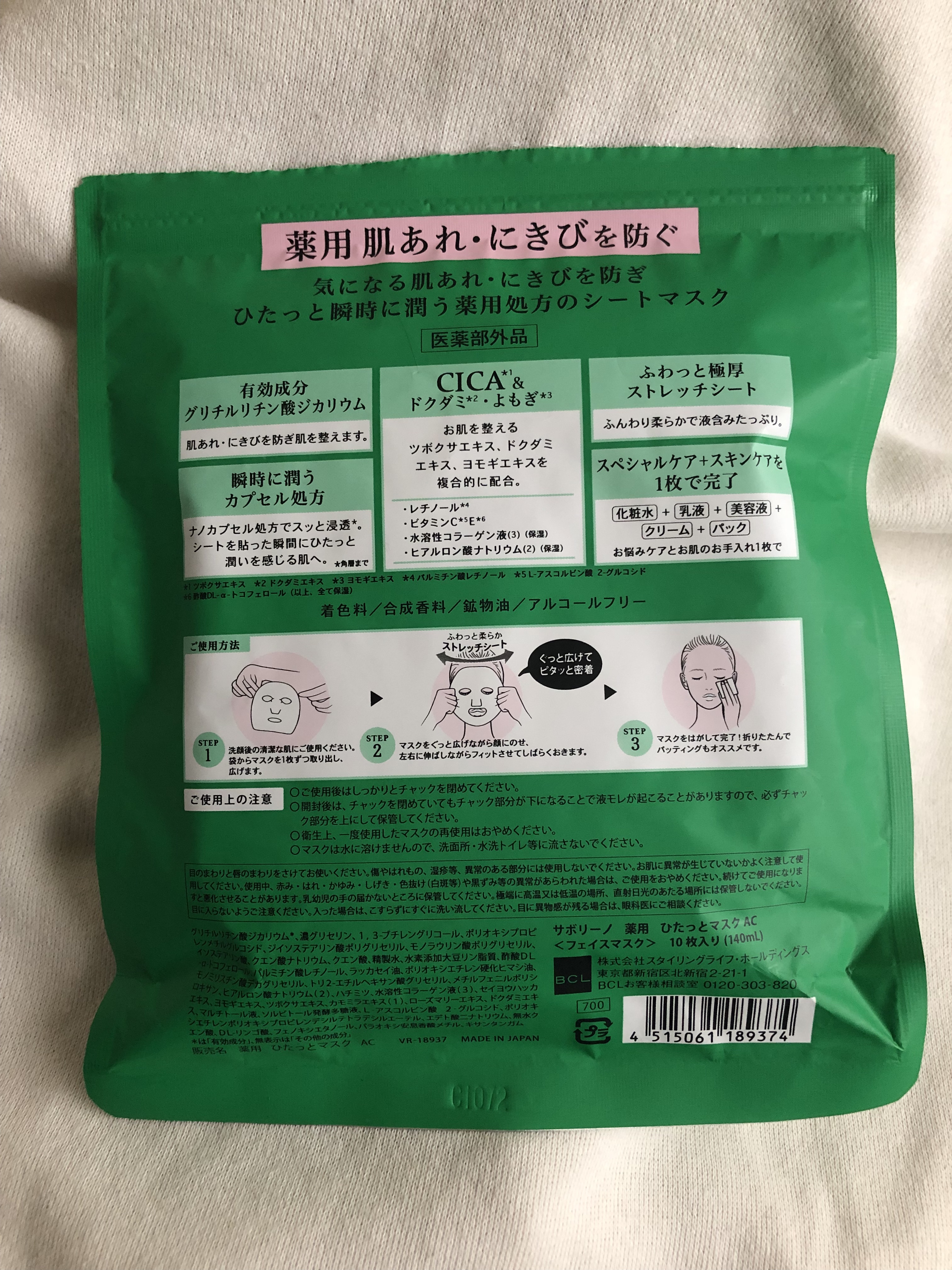 さっぱりしているけど、深くまで潤いが届いている感じ。 ベタつきもなく、夏でも使いやすい。 薬草っぽいCICAの香りもしません。 ⚫1枚5役(化粧水+乳液+美容液+クリーム+パック) ⚫有効成分配合で肌あれ・にきびを防ぎ肌を整えます。 ⚫お肌を整えるツボクサエキス、ドクダミエキス、ヨモギエキスを複合的に配合。 ⚫ナノカプセル処方で角層までスッと浸透。 ⚫液含みたっぷりのふわっと柔らか極厚シートが肌に密着。 ⚫着色料/合成香料/鉱物油/アルコールフリー