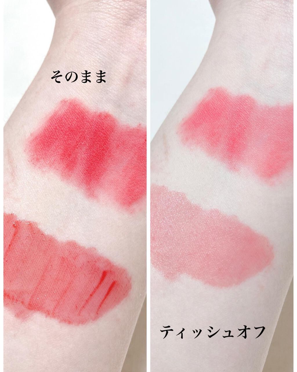 超人気なロムアンドのリップに使用感そっくりでした…🤭ロムアンド好きな方は好きなはず❣️ ティッシュオフでマスクに付かない爽やかなグレープフルーツの香り縦じわが目立たずぷっくりうるうる唇に! 微かにちらちらラメが入っていて透明感◎ 明度彩度高めの多幸感リップ💋 R03はコーラルレッドっぽくどちらかと言えばイエベさん向カラーでしたが青みを少し足せばブルベさんも違和感なく使えそう(絶妙なカラーなので人によって発色変わるかも)
