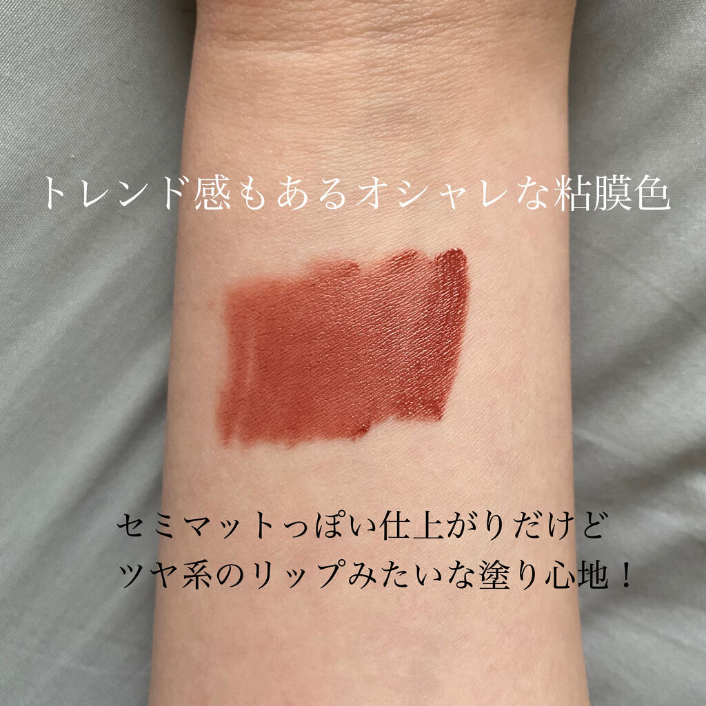 質感はしっとりマット。 リップケアをして塗らないと感想と縦皺が気になるなと思いました。 ティッシュでゴシゴシしたらほぼ色は残りませんでした🥲 ブルベさんにもってこいだと思います! 私はベタ塗りでなくぽんぽん塗りして手持ちのshu uemura ルージュ アンリミテッド キヌ クリームと合わせてちょっとヌーディな色味にすると使えそうだなと思います☺︎ オイルやグロスを合わせて艶感を出してあげると使いやすくなるかなと思います!