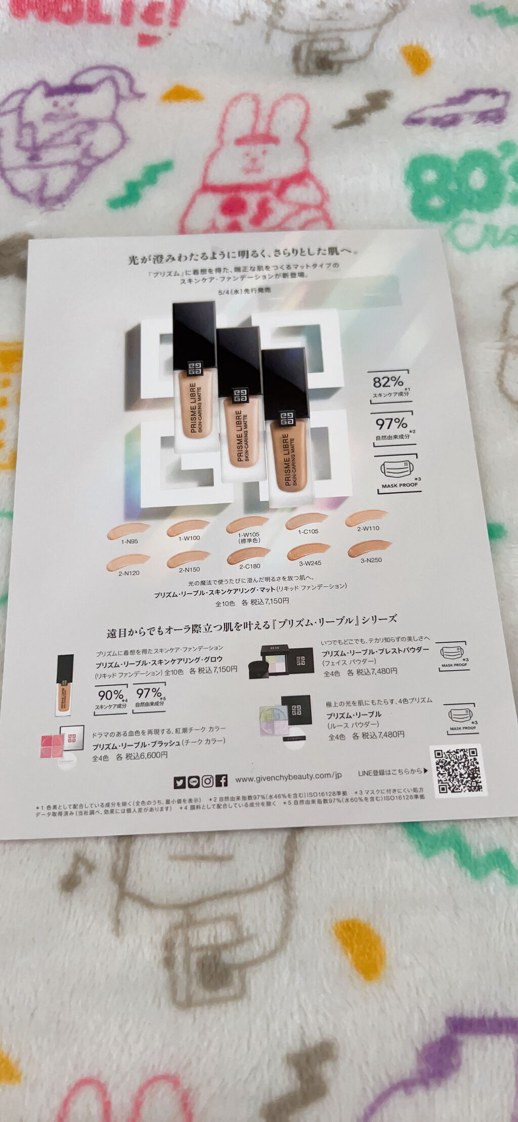 🎀GIVENCHY プリズム・リーブル・スキンケアリング・マット ¥6,700リキッドファンデーションです。このファンデーション、グロウタイプの方が人気かもしれませんが、、私は断然マット推しです。私の肌質は オイリー肌寄りの混合肌なのでいつも硬めのクリームファンデをポイントで塗るか、パウダーファンデで済ませているんですが、このファンデは夕方になってもドロドロになることもなく、マットなのに軽い仕上がりで乾燥しすぎることもないので、とても使いやすかったです!最初試供品で試したところ とてもよかったのでついに購入しました。内側からほんのり発光するような仕上がりで見た目が厚塗りに見えることもなかったです。5点おきして塗るというより、定着が早いので、のせたところから伸ばして徐々に広げていく方が均一に塗れます。私は毛穴の多いところはブラシ塗りして広げてから仕上げにパフで整えてます。ノンコメドジェニックなところも◎香りはよくある高級化粧品のような感じなので香りに敏感な人、苦手な人は 注意⚠️あと、日焼け止め効果の成分も入ってないので別で塗る必要はありますが、私は紫外線吸収剤が合わない肌質なので 逆にありがたいです。自分に合う日焼け止めを塗った後に このファンデーションを塗っています。✼••┈┈••✼••┈┈••✼••┈┈••✼••┈┈••✼公式サイトより↓↓「プリズム」に着想を得た、端正な肌をつくるマットタイプのスキンケア・ファンデーション。自然界における神秘的な光の魔法、プリズムに着想を得たフォーミュラで、まるで後光がさしているように、オーラが際立つ肌へ。隙がなく端正で、凛とした印象を叶えるナチュラルマットな仕上がり。汗、水分での崩れに強く、色移りしにくい処方。ノンコメドジェニックテスト済*3光の魔法が肌を軽やかに保ち、使うたびに澄んだ明るさを放つ肌へ。*1顔料として配合している成分を除く*2自然由来指数97%(水60%を含む)ISO16128準拠*3全ての方にコメド(ニキビのもと)が発生しないということではありません✼••┈┈••✼••┈┈••✼••┈┈••✼••┈┈••✼⭐️全成分⭐️水・(C9-12)アルカン・トリ(カプリル/カプリン酸)グリセリル・プロパンジオール・シリカ・エタノール・(カプリル/カプリン酸)ヤシアルキル・セスキイソステアリン酸ソルビタン・ペンチレングリコール・プルラン・ステアラルコニウムヘクトライト・トリメチルシロキシケイ酸・ポリリシノレイン酸ポリグリセリル-3・ジイソステアリン酸ポリグリセリル-3・ミリストイルグルタミン酸NA・塩化NA・ヒドロキシアセトフェノン・香料・ソルビン酸K・マルトデキストリン・ベニノキ種子エキス・ノウゼンハレン花/葉/茎エキス・水酸化AL・カオリン・ポリヒドロキシステアリン酸・トコフェロール・合成フルオロフロゴパイト・1,2-ヘキサンジオール・カプリリルグリコール・イライト・イソステアリン酸・レシチン・クエン酸(+/-)酸化スズ・酸化チタン・酸化鉄#GIVENCHY#プリズム・リーブル・スキンケアリング・マット#リキッドファンデーション
