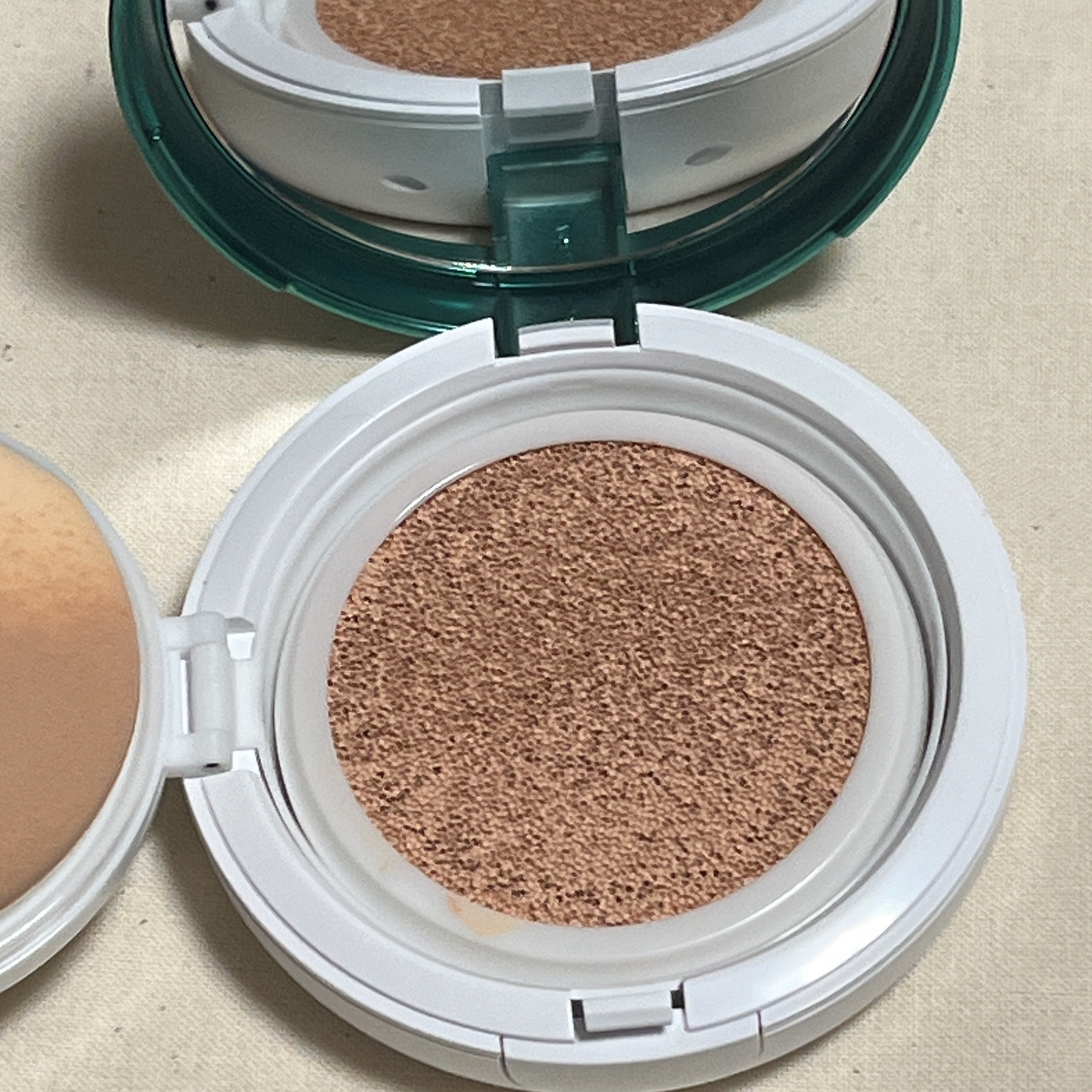 鎮静に効果的なスーパーシカアンプルの有効成分をたっぷりそのまま10,000ppm配合🤲🏻🌿 鎮静効果を高めるティーツリー 水分バリアを強化する特許成分ヒュメクシル バリア機能を支えるセラミド 配合で肌への刺激を抑え、メイク中も肌を守ってくれるクッションファンデーション🐯💚 マスクプルーフでマスク移りしにくく高密着で擦れと蒸れにも強かったです💪🏻꙳⋆ カバー力も高く、気になる部分は重ねづけするとコンシーラーなしでもいけるくらいでした😳❣️ みずみずしく少量でよくついてくれるので最初のクッションを抑えめに、量を調節しながら塗っていくと厚塗り感が出なくておすすめです🙆🏻♀️ 仕上がりは艶もありつつ陶器のようなセミマットな仕上がりで日中は乾燥も気になりませんでした🤍 今回使用した〖21号:フェア アイボリー〗は標準色よりやや明るめを選ぶ私には少し白く感じたので新色の中間色ライトベージュが気になっています🤭💕