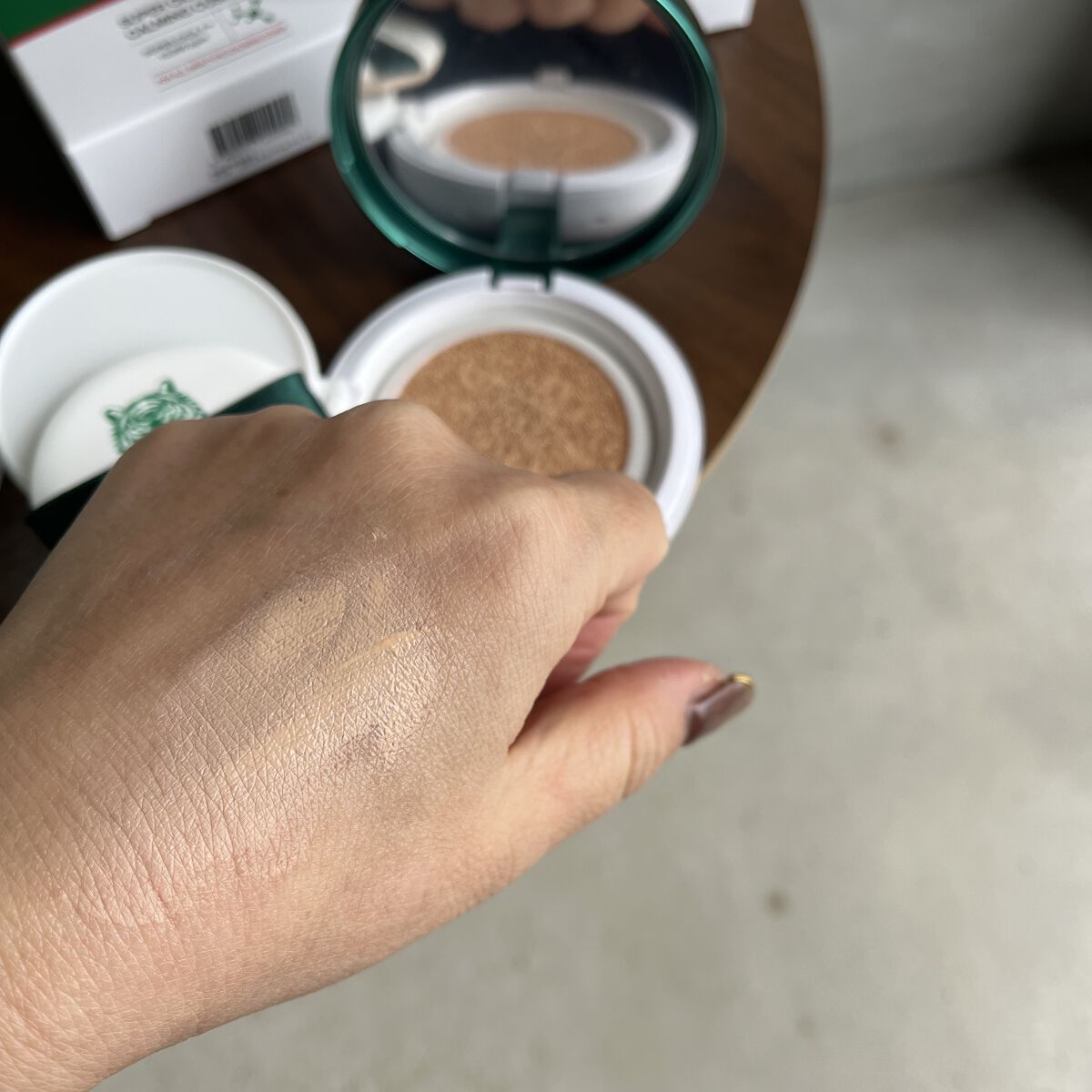 精製水の代わりに高濃縮のツボクサエキス88% 高濃縮、たっぷりのシカエキス トナーパッドで鎮静ケア♡ やわらかなパッドでさっぱりとした使用感 ニキビや肌荒れにもアプローチ シカエッセンスがたっぷり含まれたクッションファンデ SPF50 PA+++で紫外線もしっかり対策 軽いテクスチャーで良く伸び肌なじみが良い セミマットな仕上がりですがツヤもややあって厚塗り感なく、ナチュラル マスクプルーフタイプでマスク移りがしにくかったのでマスクメイクに嬉しい どちらのアイテムも低刺激に関する臨床試験済みだそうなのでゆらぎがちな時や敏感肌にも使いやすいです