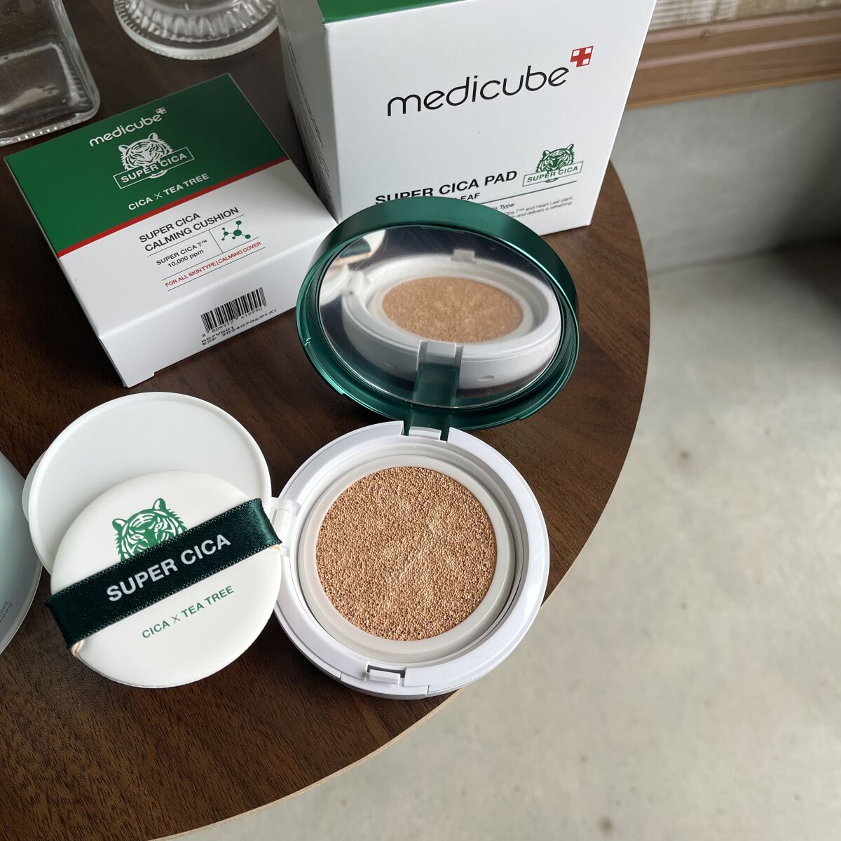 ...medicubeスーパーシカパッドスーパーシカクッション❀スーパーシカパッド70枚入ゆらぎ肌鎮静ケア.ᐟ水分鎮静パッド•.✦。精製水の代わりに高濃縮のツボクサエキス88%+スーパーシカ7種類を含有。(ツボクサエキス・ツボクサ根エキスツボク葉エキス・アジアチンコミドアジアチン酸・マデカシン酸・マデカソサイド)高濃縮、たっぷりのシカエキス.ᐟ.ᐟ.ᐟドクダミエキス×シカ成分でW鎮静✲*゚トナーパッドで鎮静ケア♡写真で伝わるかな?大きなボトル.ᐟ.ᐟ大容量で惜しみなく使えちゃう♬.*゚水分たっぷりひたひたで厚みのあるパッド。洗顔後に凹凸のエンボシング面で拭き取りフラットな面でパッティング。やわらかなパッドでさっぱりとした使用感。やわらかくなめらかな肌あたりだけどしっかりした生地のパッドなので1枚ですっきり拭き取れます。ニキビや肌荒れにもアプローチ.ᐟ夏特に気持ちよさそうだと思う拭き取りパッド。気になるところには部分パックとしても○中蓋とピンセット付き、ピンセットをしまって保管できるのも衛生的✧*。❀スーパーシカクッションSPF50+PA+++22#LIGHTBEIGEシカエッセンスがたっぷり含まれたクッションファンデ。メイクしながら同時に鎮静ケアが出来る♡SPF50PA+++で紫外線もしっかり対策。軽いテクスチャーで良く伸び肌なじみが良い。薄づきで肌に密着、カバー力があり綺麗。セミマットな仕上がりですがツヤもややあって厚塗り感なく、ナチュラル。マスクプルーフタイプで今まで私が使っていたクッションファンデよりもマスク移りがしにくかったのでマスクメイクに嬉しい𖤐´-21号ペアアイボリー22号ライトベージュ23号ヌードベージュカラーは3展開から選べます✰*。どちらのアイテムも低刺激に関する臨床試験済みだそうなのでゆらぎがちな時や敏感肌にも使いやすいです。朝の洗顔の代わりにスーパーシカパッドで拭き取り、スーパーシカクッションでメイク。最近の私の朝の流れになりつつあります.*⸜·͜·⸝*