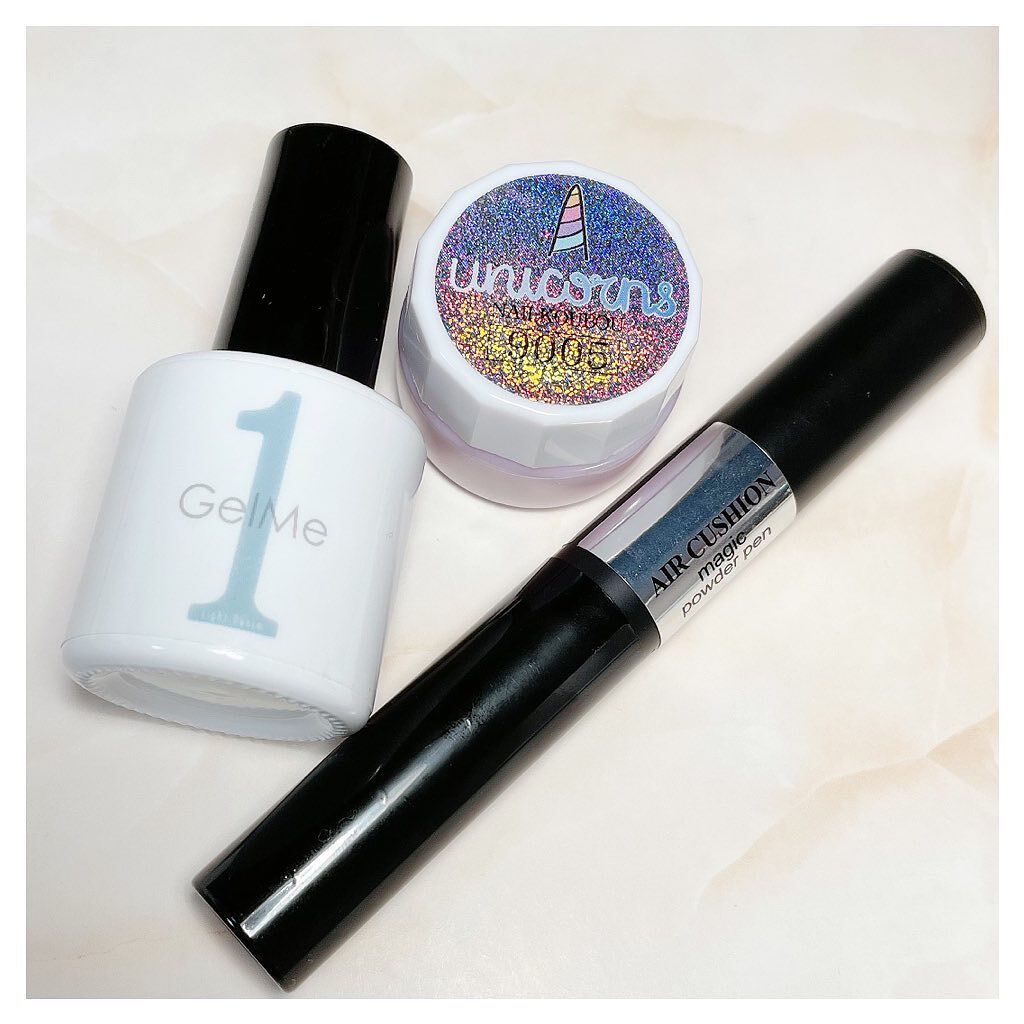 GelMe1はがせるベース GM-57右手→ペールアイス GM-74左手→アッシュピンク GM-62両手の薬指に重ねる→オーロラシルバー GM-39(写真にはボトル載ってないです)追加で3本買いました!その写真が2枚目です。前にノンサンディン...