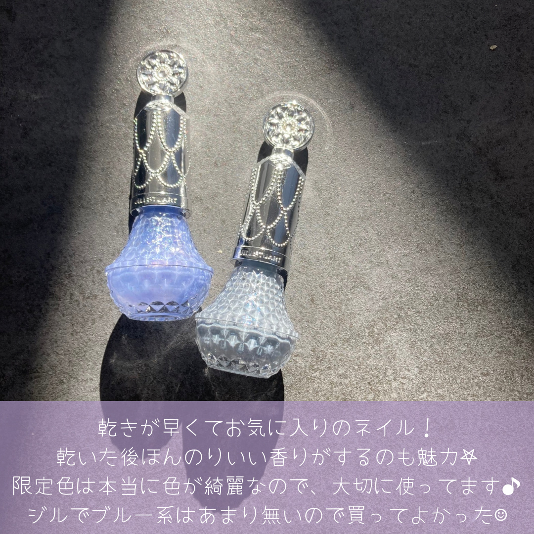 液は割りととろっとしていて、仕上がりは少し厚みが出るような感じになってます◎ 速乾とは言わないですが、乾くのは早め👌🏻 重ね塗りしてもヨレにくいのも良いです👏🏻 ジルらしい甘めフローラルな香りで、ネイル独特の嫌な匂いがしないのが嬉しい💕 クリーミーなミルキーカラーが可愛すぎる💕 落ち着いた上品な雰囲気のピンクです😌 角度によってキラキラするシルバーパールと、全体の白ツヤが可愛すぎること🥹 グレーみのあるブルーがとっても綺麗な、クールなのにどこか幻想的なカラーです💙