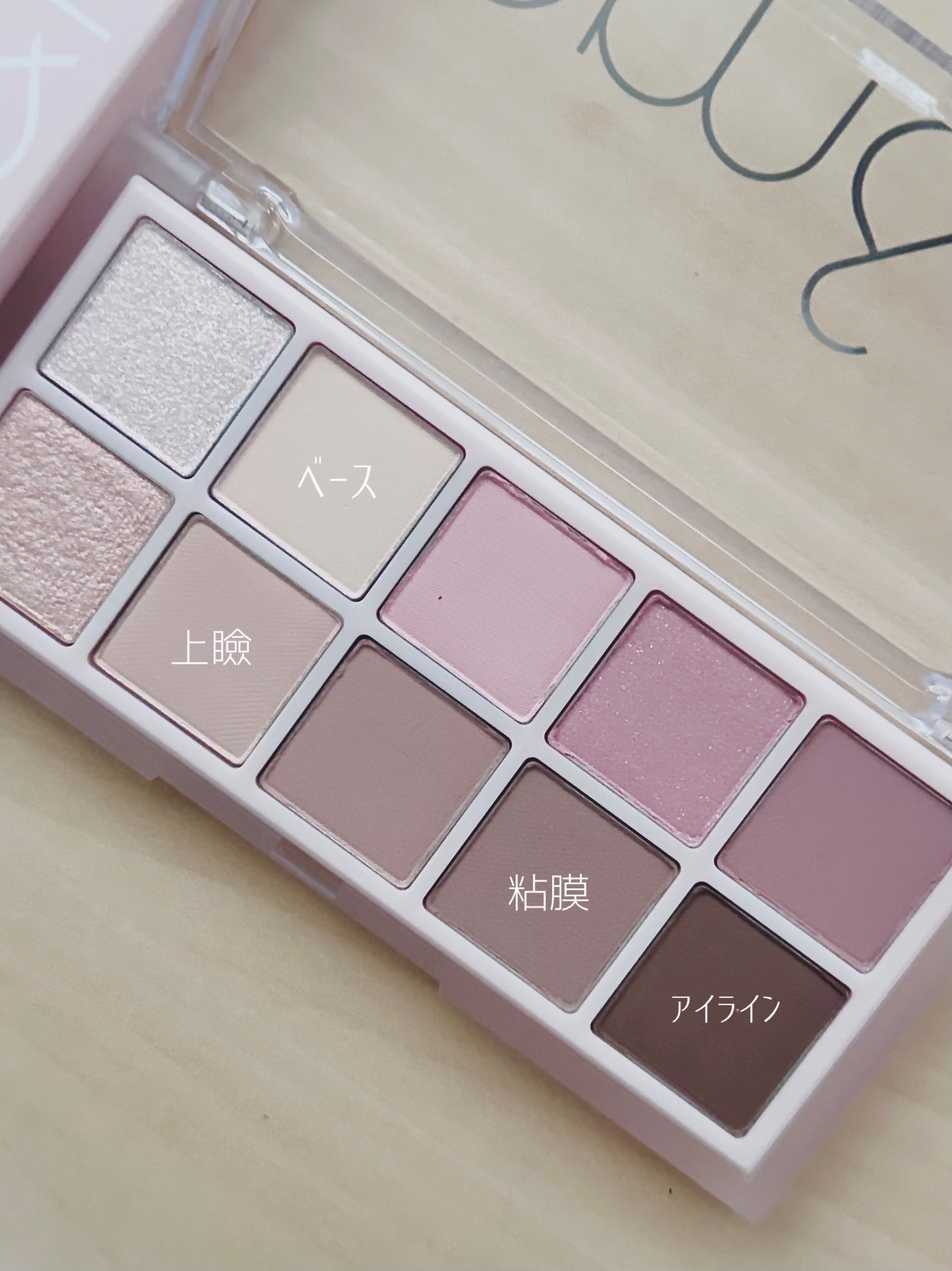 淡い色だけど、単色でも、重ねても綺麗です。 上段はピンク系、下段はブラウン系でまとめることができます。 10色のうち、3色がラメですが、ギラギラしてないので、本当に使いやすいです。 ベースカラーは、ほぼ色はつかないくらいなんですが、アイホールに入れると、くすみがとんで明るくなります。