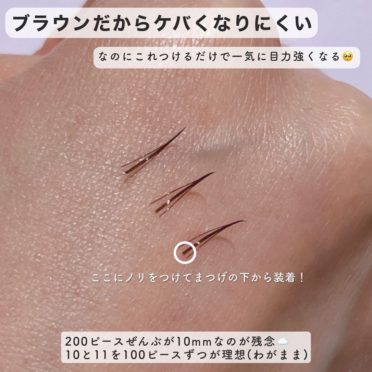 私は日常使い出来るようなものが欲しかったので短めの10mm、ブラウンカラーにしたよ◎ この10mmがちょうど良いの🥹✨ ブラウンだから馴染みも良いし「つけまつけて束まつげにしています私」感が出ない💘 200ピースと大容量、1回で10束ちょい使うとしても約20回分ももつというコスパ🫰🏻 付け心地も軽いし、ピンセットとノリもついてた!束つけまをよく使うならこれがいちばんコスパ良いと思う。